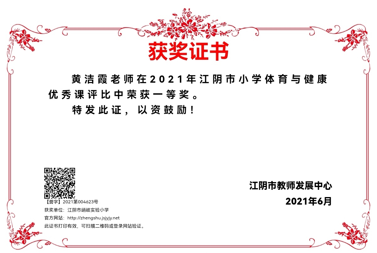 沈菁名师工作室成员——黄洁霞获江阴市小学体育与健康优秀课评比一等奖