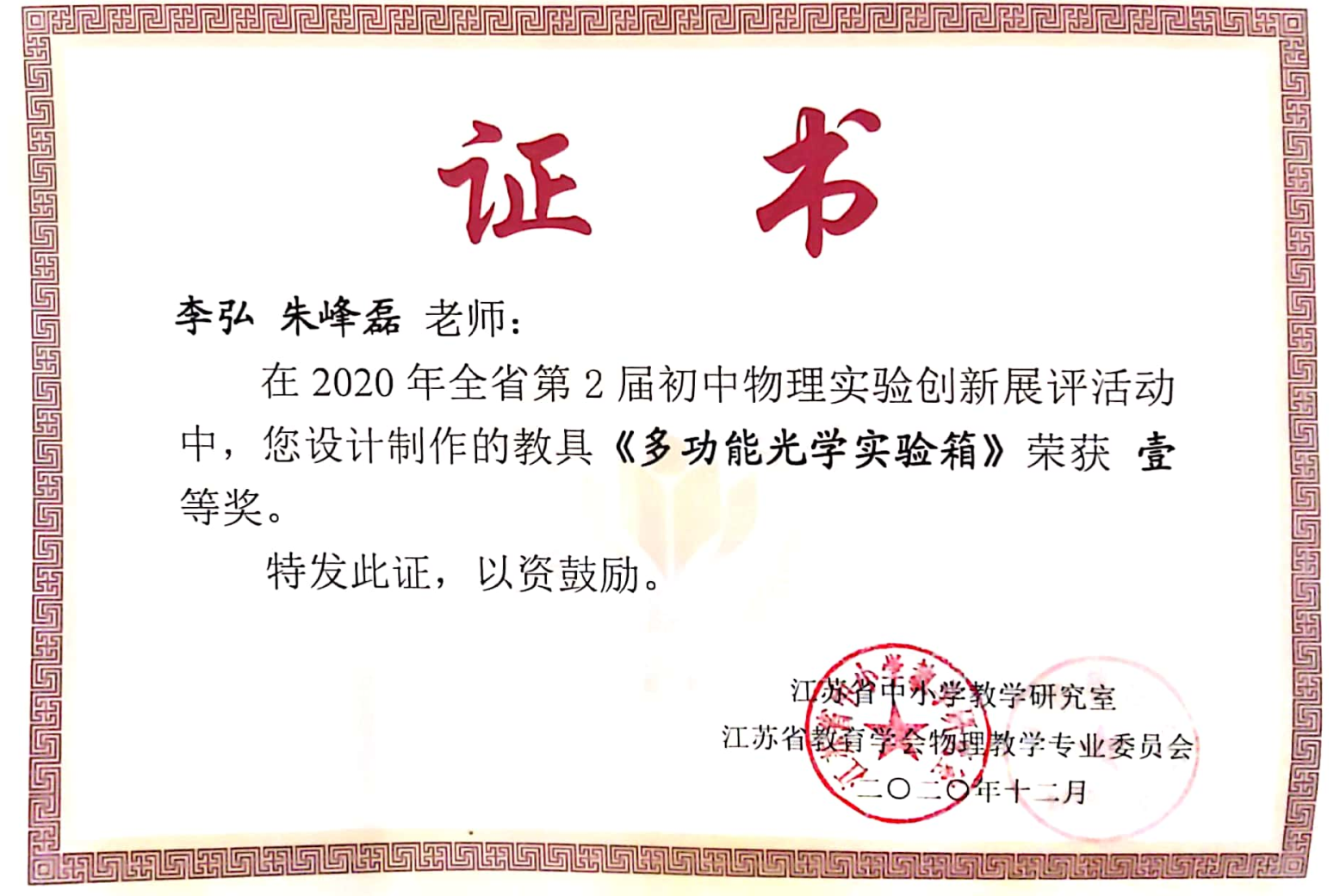 李弘老师在2020年江苏省第2届初中物理创新展评活动中,自制的教具《多功能光学实验箱》荣获江苏省一等奖