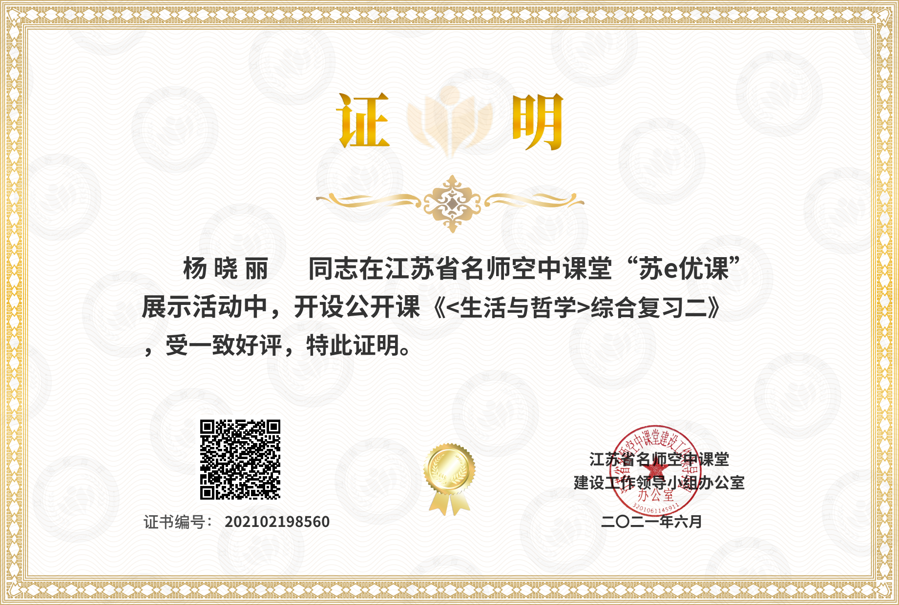 杨晓丽公开课《生活与哲学综合复习二》获“苏e优课”