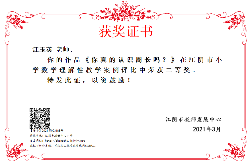 匡金龙名师工作室成员江玉英老师在江阴市小学数学理解性教学案例评比中获江阴市二等奖