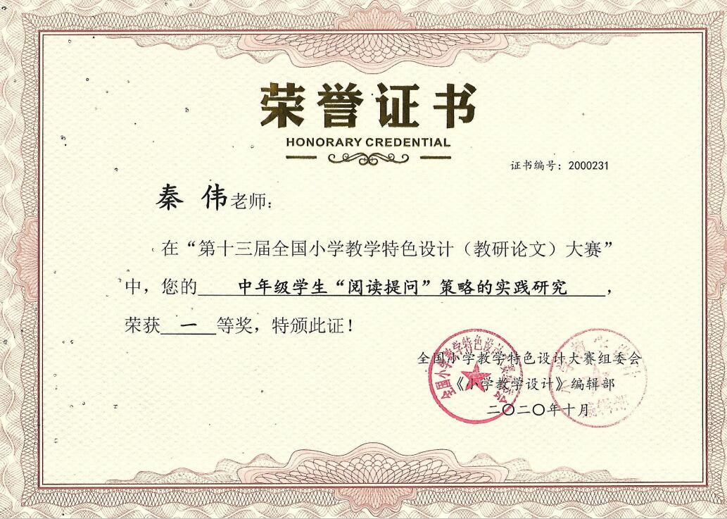 秦伟老师论文获“第十三届全国小学教学特色设计(教研论文)大赛”一等奖