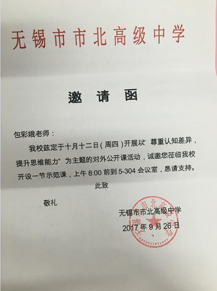 2017年10月12日,无锡市市北中学开设“尊重认知差异,提升思维能力”为主题的对外公开课活动,我工作室成员包彩娥应邀前往开设示范课。