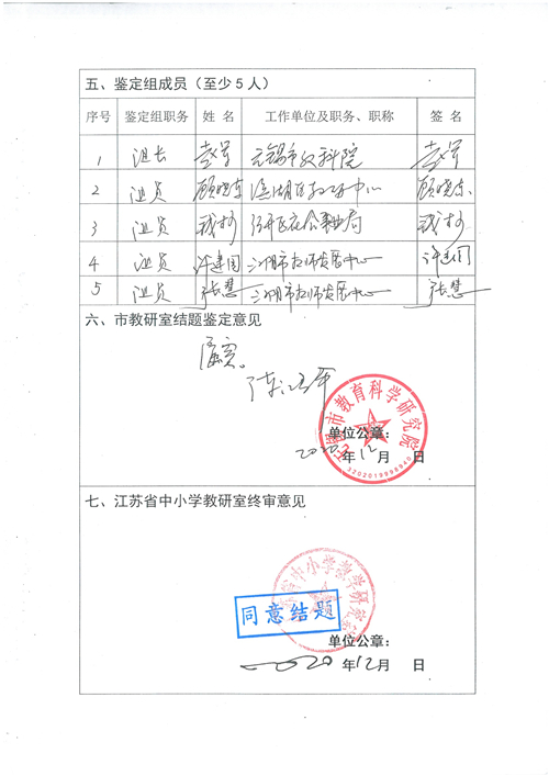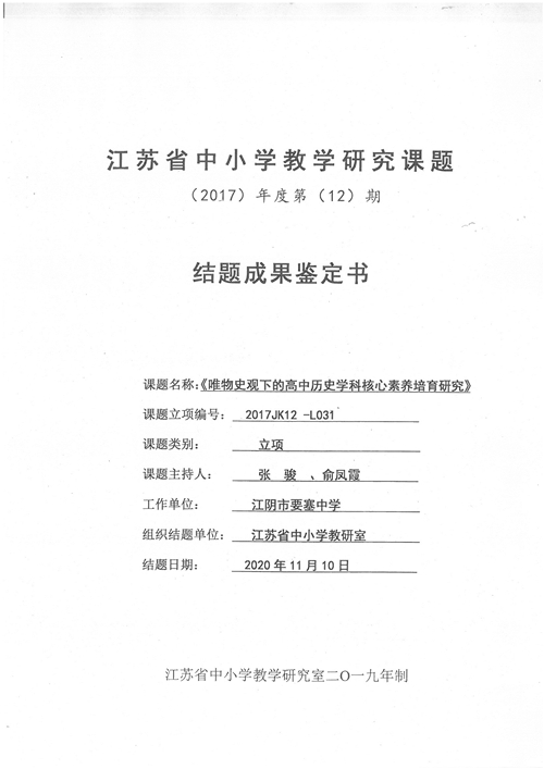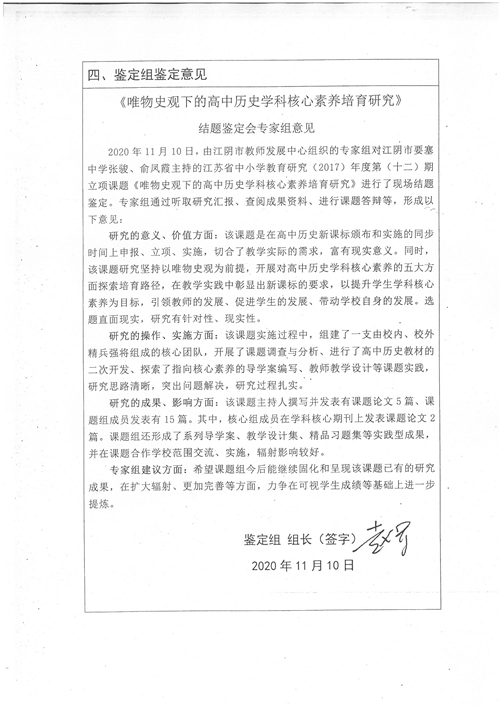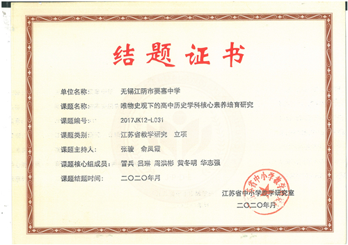 (教科室 吴伟国供稿)2020年11月10日,我校张骏、俞风霞主持的《唯物史观下的高中历史学科核心素养培育研究》课题在江阴市教师发展中心通过了结题鉴定。该课题是江苏省中小学教学研究(2017)年度第(十二)期立项课题,于2017年11月通过江苏省中小学教学研究室立项,2018年5月在宜兴市教师发展中心通过开题论证,2019年12月在无锡市教育科学研究院通过中期评估,至结题经历了三年多的研究与实施,并取得了丰硕的课题成果,同时也产生了有一定范围的成果辐射影响。