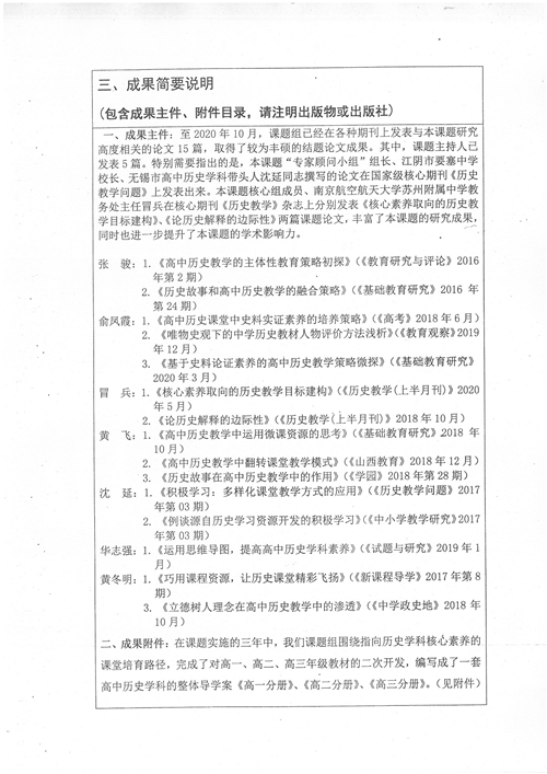 经过三年的探索、研究、实施,《唯物史观下的高中历史学科核心素养培育研究》课题产生了一系列研究成果,课题组有15篇课题论文在各级期刊上发表出来。课题主持人张骏、俞凤霞发表课题研究论文5篇,课题组核心成员冒兵在核心期刊《历史教学》上发表课题论文2篇,校长沈延在核心期刊《历史教学问题》上发表课题论文1篇。课题组还通过编制与实施指向历史学科核心素养的“高中历史系列导学案”、“高中历史教学设计集”、“高三历史精品习题集”等,探索出了具有本校特色的“唯物史观下的高中历史学科核心素养培育”的课堂教学,达成了课题预期的研究目标。这些成果的呈现,得到了与会省市专家组的高度评价。同时,该课题实施中,还组织了课题研究的横向合作,与江苏省南菁高级中学、南京航空航天大学苏州附属中学、泰州市刘国钧中学、江阴市长泾高级中学、江阴市祝塘中学、江阴市第二中学等开展了同课异构的教学研讨和“课题研究进课堂”公开展示,为教学课题“指导、服务于课堂教学”作了切合、务实的探索。