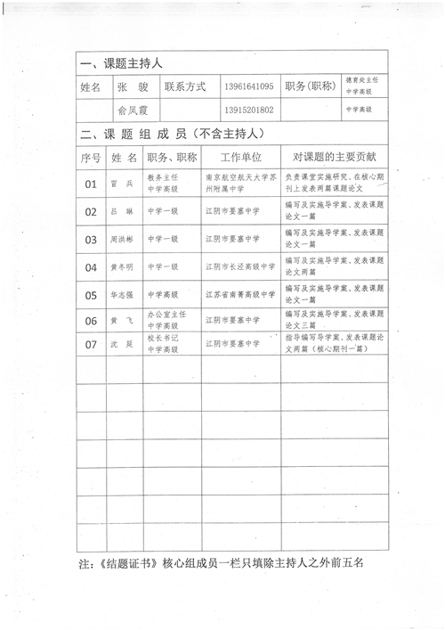 在该课题开题论证后,课题主持人张骏、俞风霞广泛吸纳精兵强将、学科一线,南京航空航天大学苏州附属中学教务主任冒兵、江阴市长泾高级中学历史教研组长黄冬明加盟进本课题,组成了有本校的周洪彬、吕琳、黄飞、张科君,外校的冒兵、黄冬明等课题核心组成员,校长沈延担任了该课题的研究指导工作。