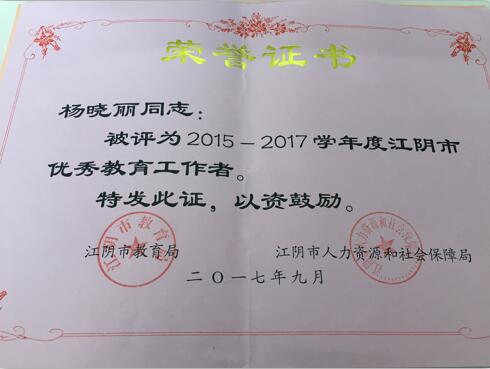我室工作室成员杨晓丽老师被评为”江阴市优秀教育工作者“ 技术支持:江苏迅和信息科技有限公司