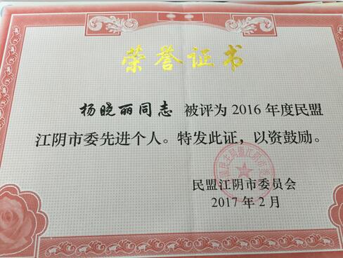 我室工作室成员杨晓丽老师被评为”民盟江阴市委先进个人“ 技术支持:江苏迅和信息科技有限公司