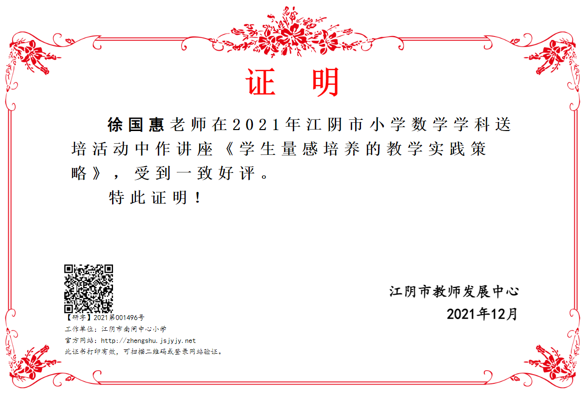 包静娟工作室成员徐国惠在江阴市作讲座《学生量感培养的教学实践策略》