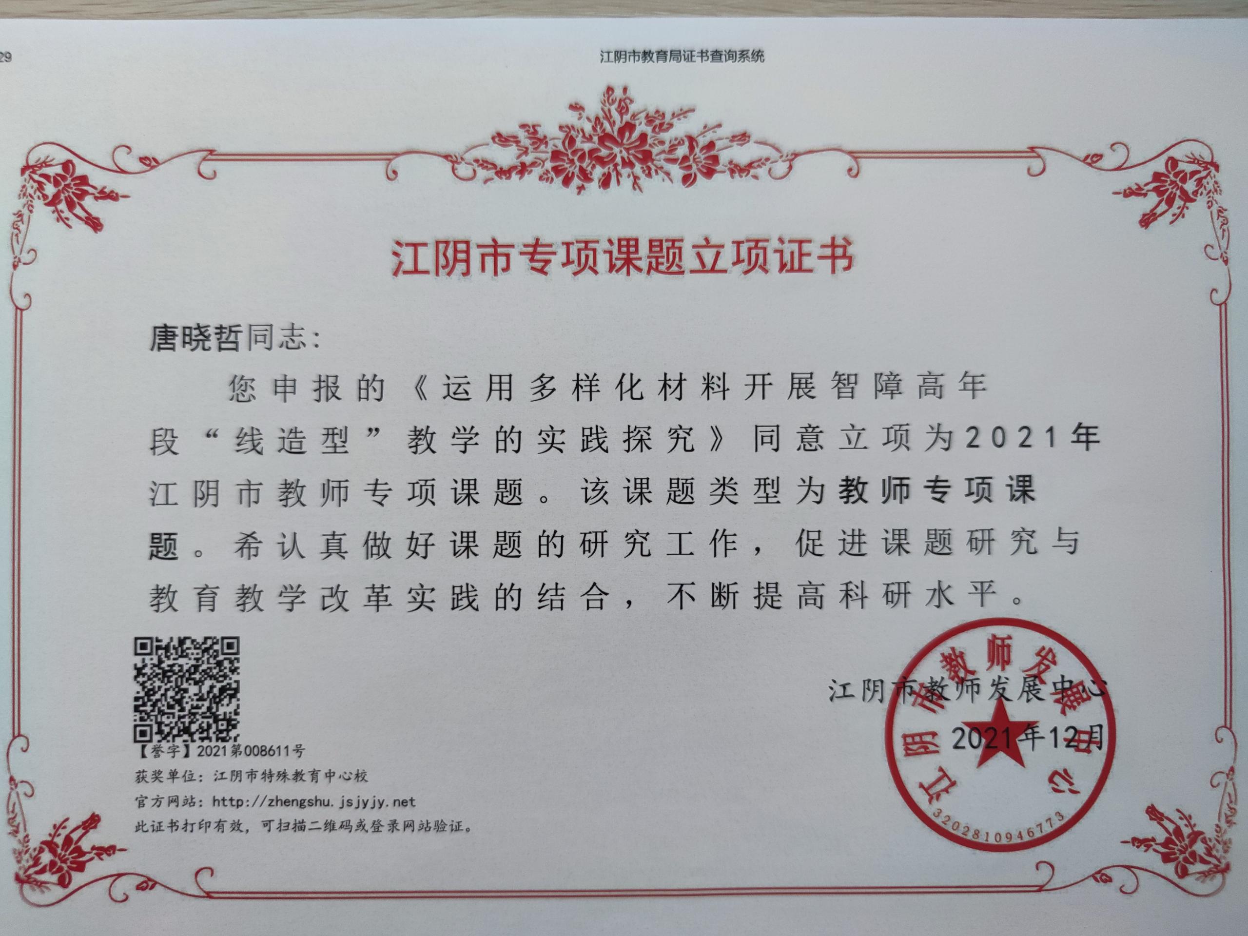 唐晓哲江阴市专项课题立项《运用多样化材料开展智障高年段“线造型”教学的策略研究》