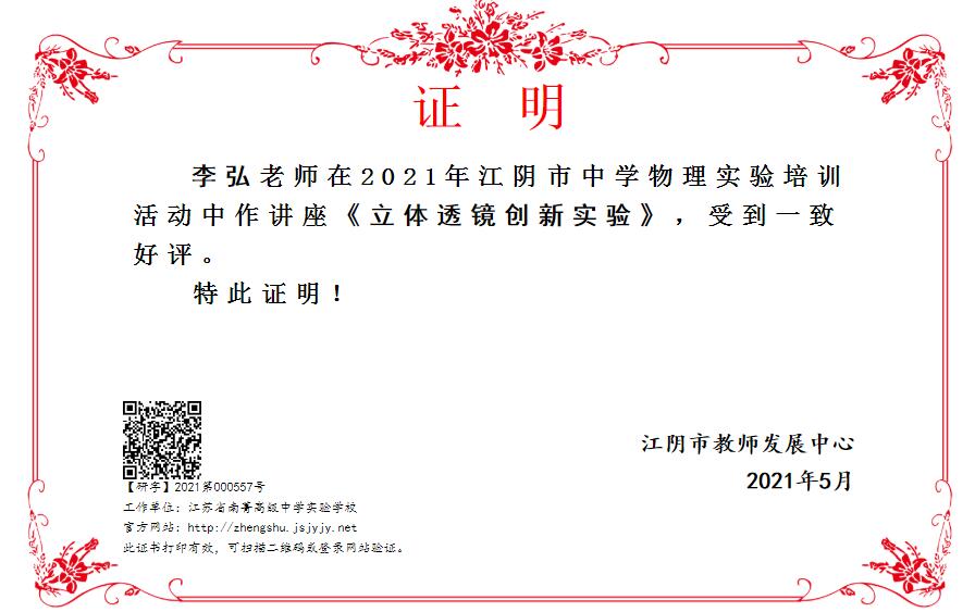李弘老师在2021年江阴市中学物理实验培训活动中作《立体透镜创新实验》讲座
