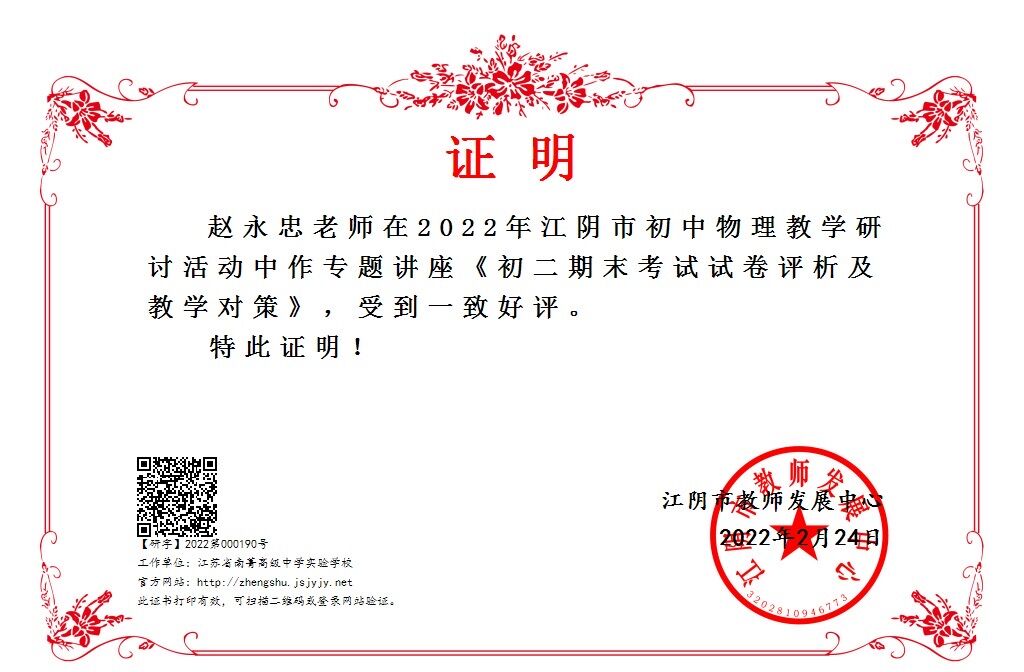 赵永忠于2022年给江阴市全体初二物理教师作《初二期末考试评析及教学策略 》讲座