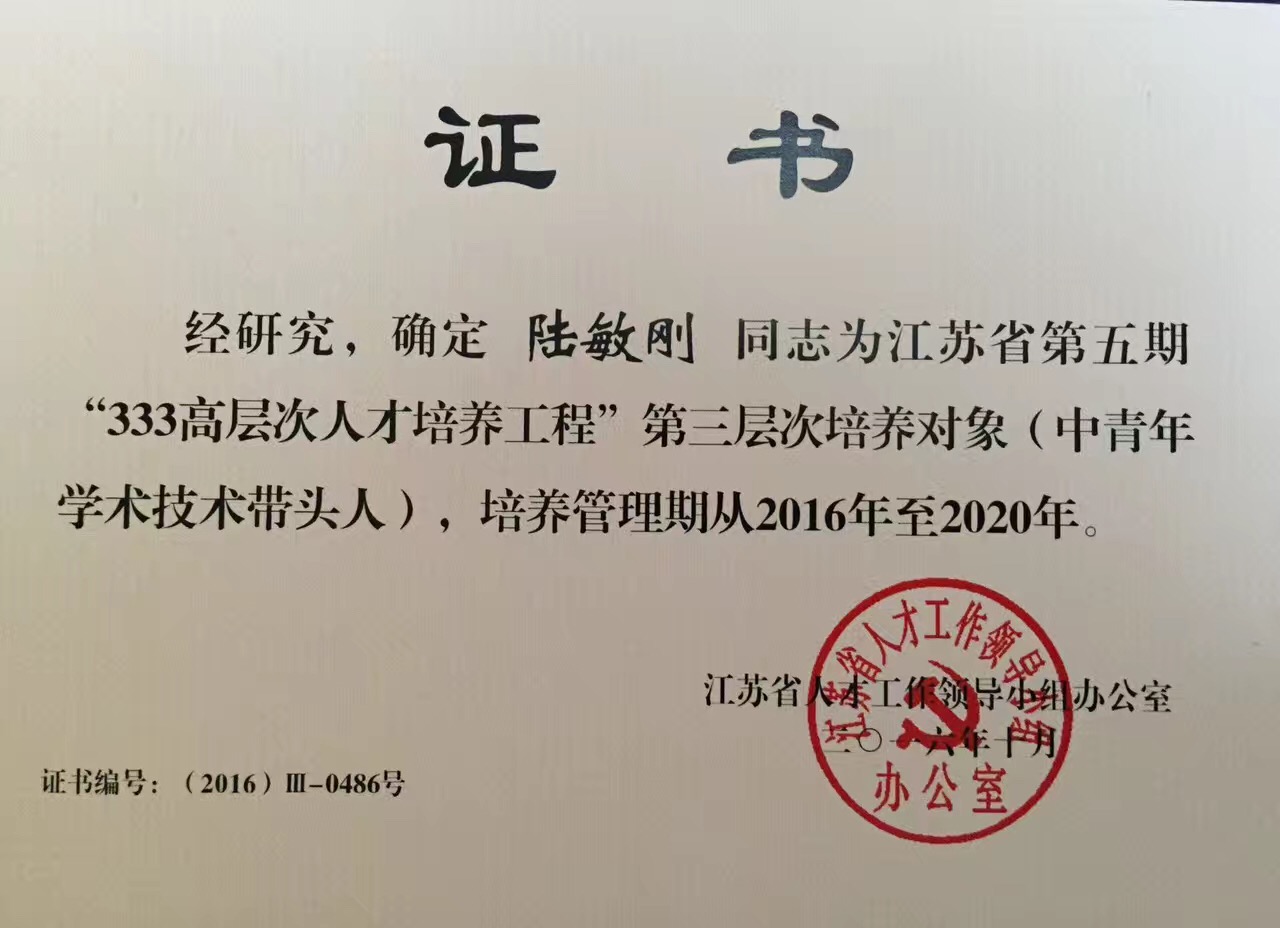 陆敏刚被评为“江苏省333高层次人才培养工程”中青年学术带头人