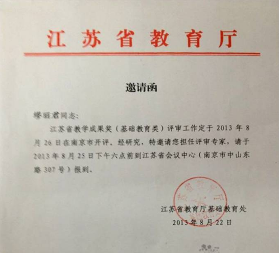 2013年8月缪丽君导师应邀担任江苏省基础教育类教学成果奖评审专家