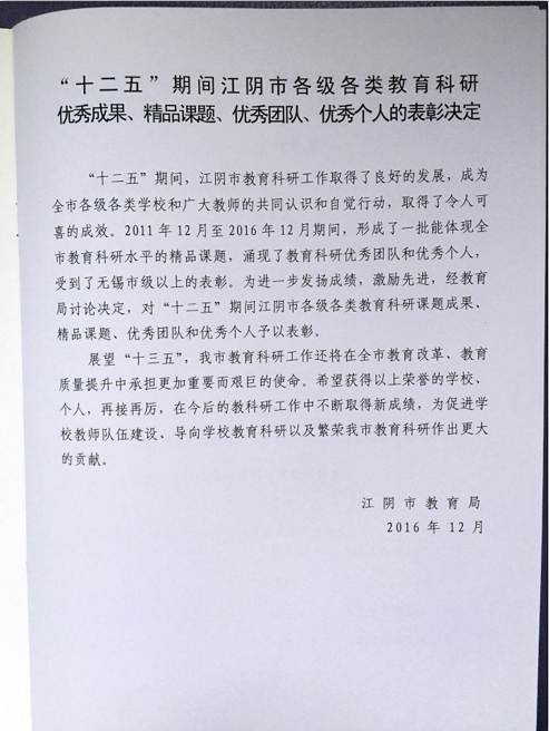 缪丽君导师被评为2014-2016年度无锡市教育督导工作先进个人