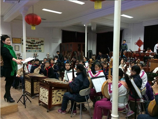 下午缪老师一行来到了徐汇中学,这是一所有着160多年历史的名校,文化底蕴深厚,尤其崇思楼,是上海市优秀保护建筑,徐汇区文物保护单位,从教学楼到学校历史文化长廊,从美术馆到民乐排练教室,到处是洋溢着浓浓的艺术氛围。央视音乐频道【风华国乐】栏目在“2011魅力校园新春音乐会”中曾播出了徐汇中学民乐团演奏的合奏曲。上海市徐汇中学教师,上海市音乐特级教师史莉莉指挥学校民乐团作了精彩展示,学生的训练有素和演奏水平为大家啧啧称道,史莉莉老师还请缪丽君老师为民乐团的学生讲话,缪老师热情赞扬了同学们良好的艺术修养、精湛的演奏技艺和对音乐作品的理解和表达。