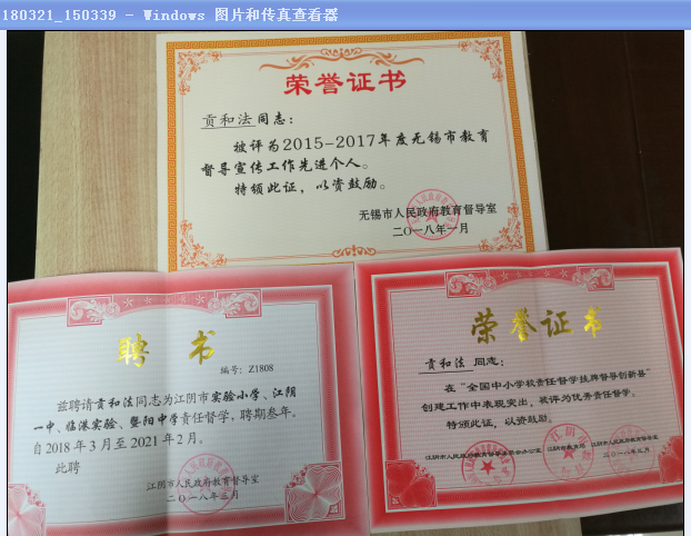 江苏省江阴高级中学贡和法老师受聘兼任江阴市第二届责任督学。贡和法老师是市首届市责任督学,从2014年3月——2017年12月4年的第一个聘期内,贡和法老师负责5所中小学的责任督学,坚持依法、民主、科学督学,履行责任督学“监督和检查”“预警和指导”的职能,真督、真导、真服务,很好的引领了所督学校教育的内涵发展。4年中,到每所学校常规督学39次,累计听课195节,访谈学校领导、师生、家长计1590人次,问卷调查730人次,协助处理投诉11件。4年中坚持了“服务发展,寓导于督”的督学理念;坚持了“学习研修,专业引领”的督学担当;坚持了“尊重为先,服务为先”的督学姿态。为江阴市“全国中小学校责任督学挂牌督导挂牌督导创新县”作了一定的努力。