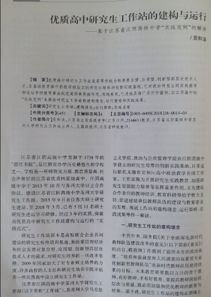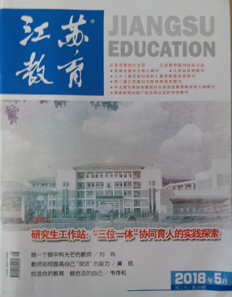 为了深入贯彻中共中央、国务院印发的《关于全面深化新时代教师队伍建设改革的意见》,推进地方政府、高等学校、中小学“三位一体”协同育人模式,《江苏教育》2018年在5月期刊上特设专栏,以江苏省江阴高级中学苏州大学研究生工作站为研究对象,探索研究生工作站“三位一体”协同育人所取得的成功经验。