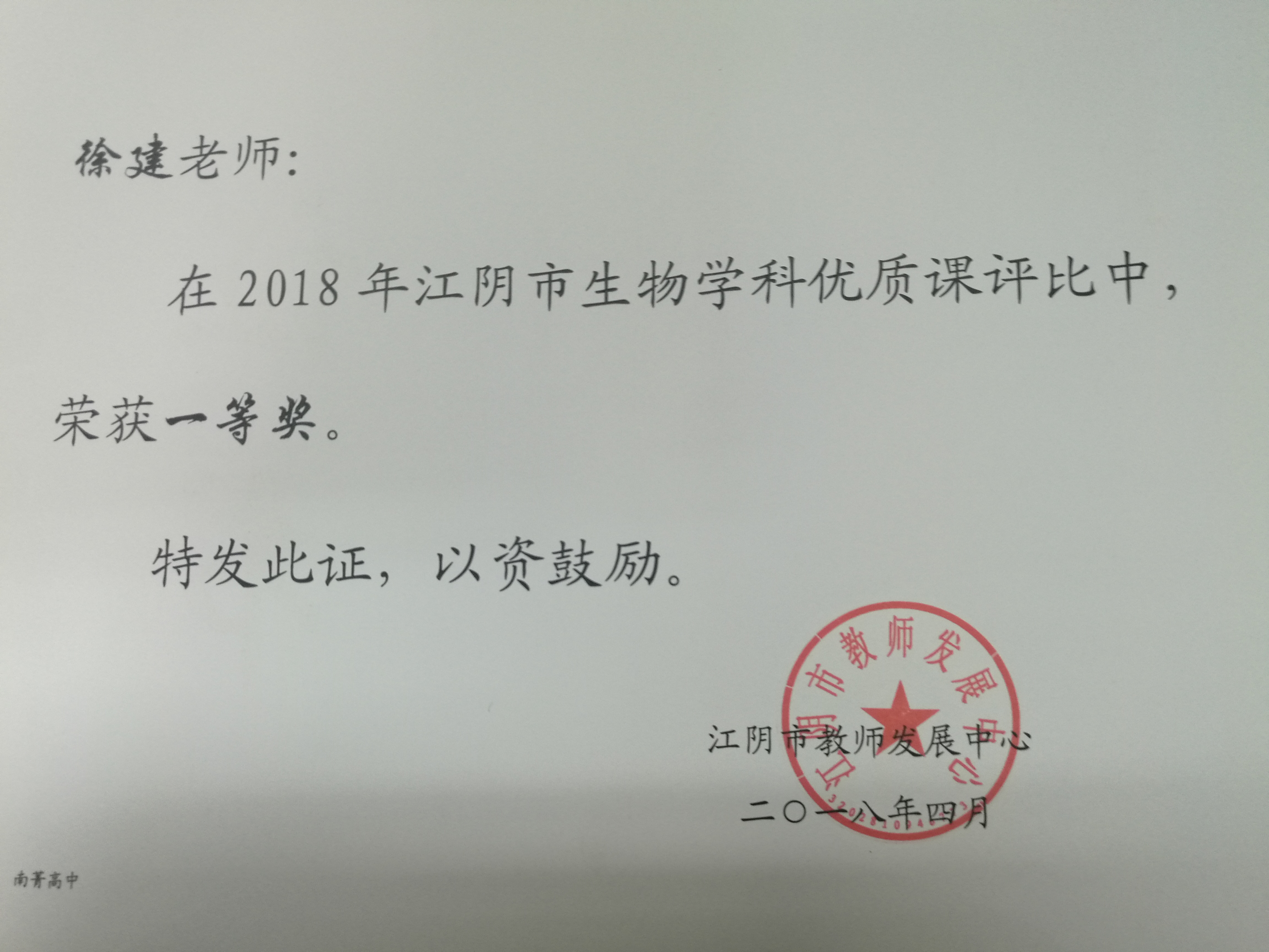 徐建老师获江阴市生物学科基本功比赛一等奖