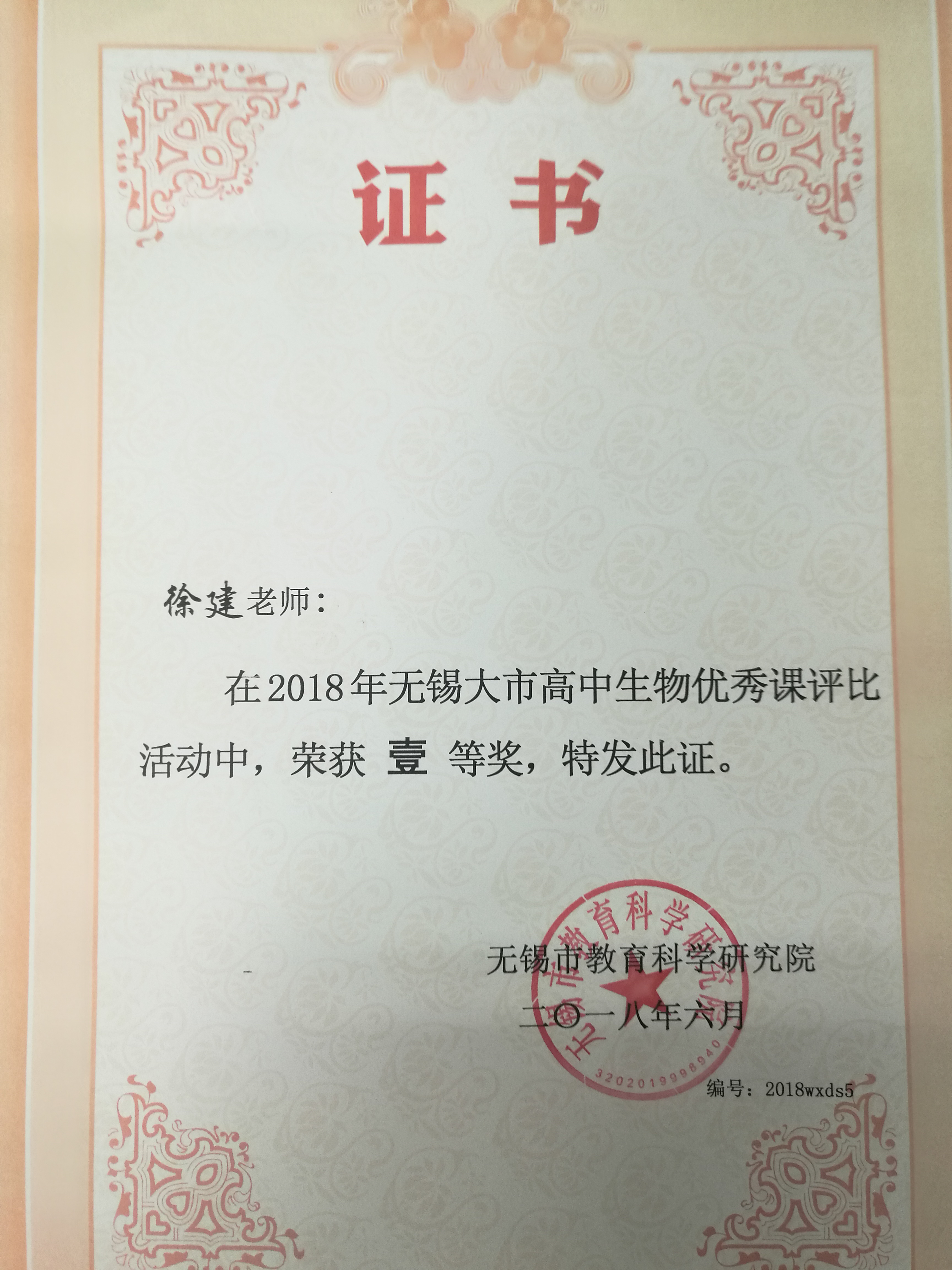 徐建老师获无锡市生物优质课比赛一等奖