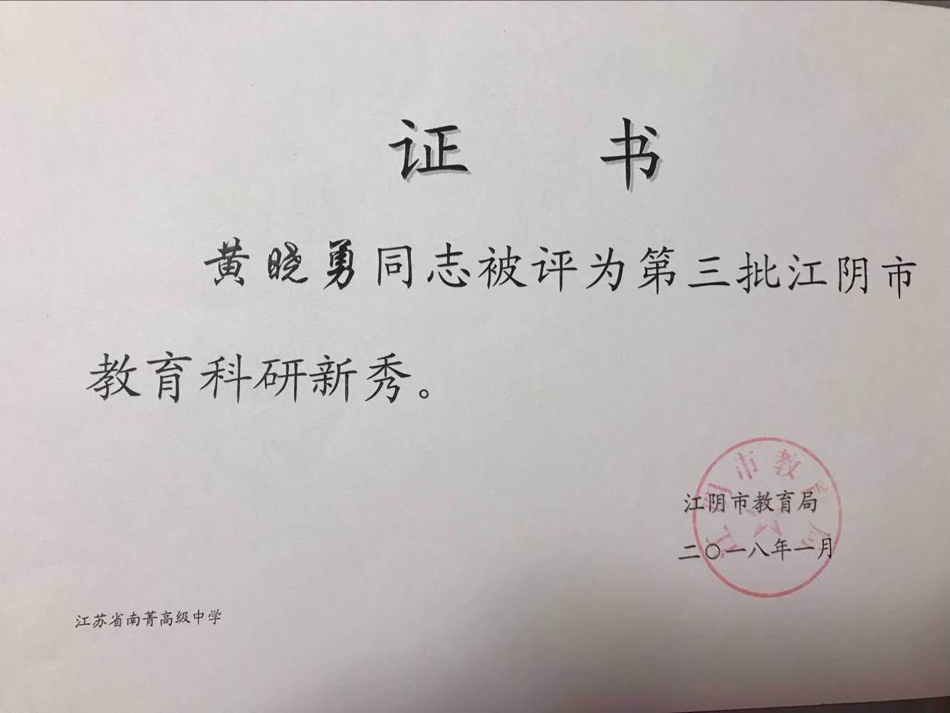 黄晓勇同志被评为第三批江阴市教育科研新秀