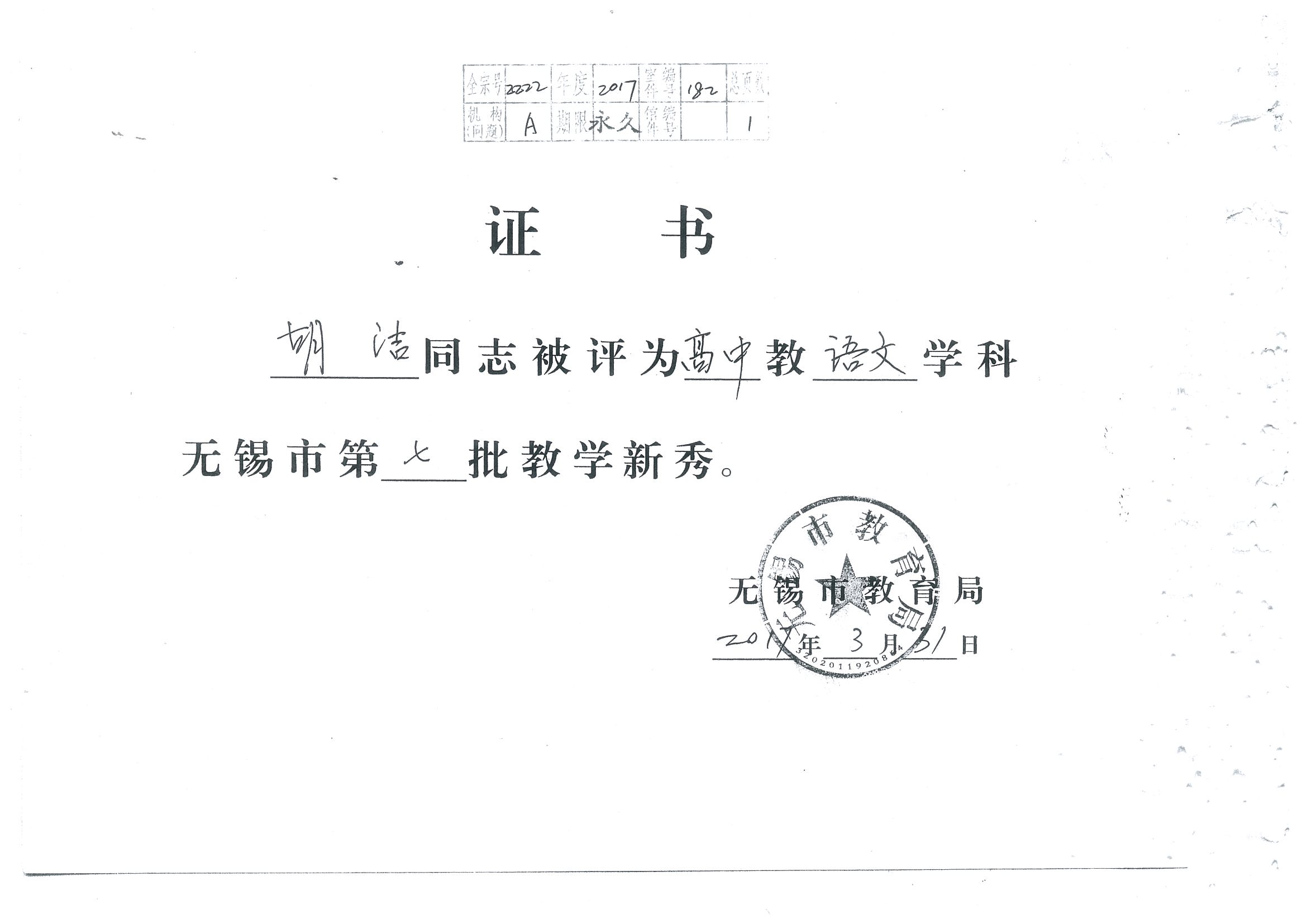 胡洁 同志被评为高中教语文学科无锡市第七批教学新秀