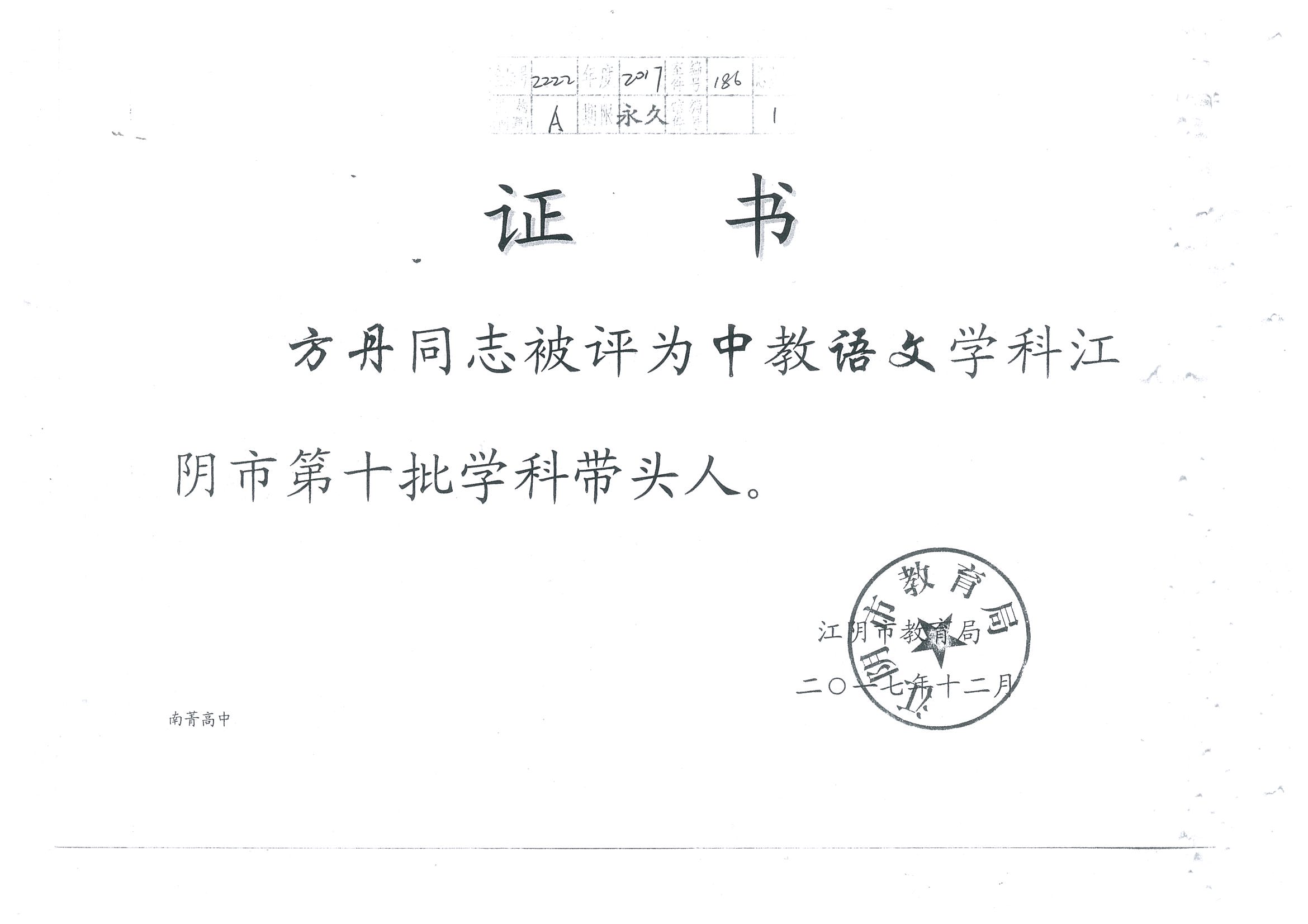 方丹 同志被评为中教语文学科江阴市第十批学科带头人
