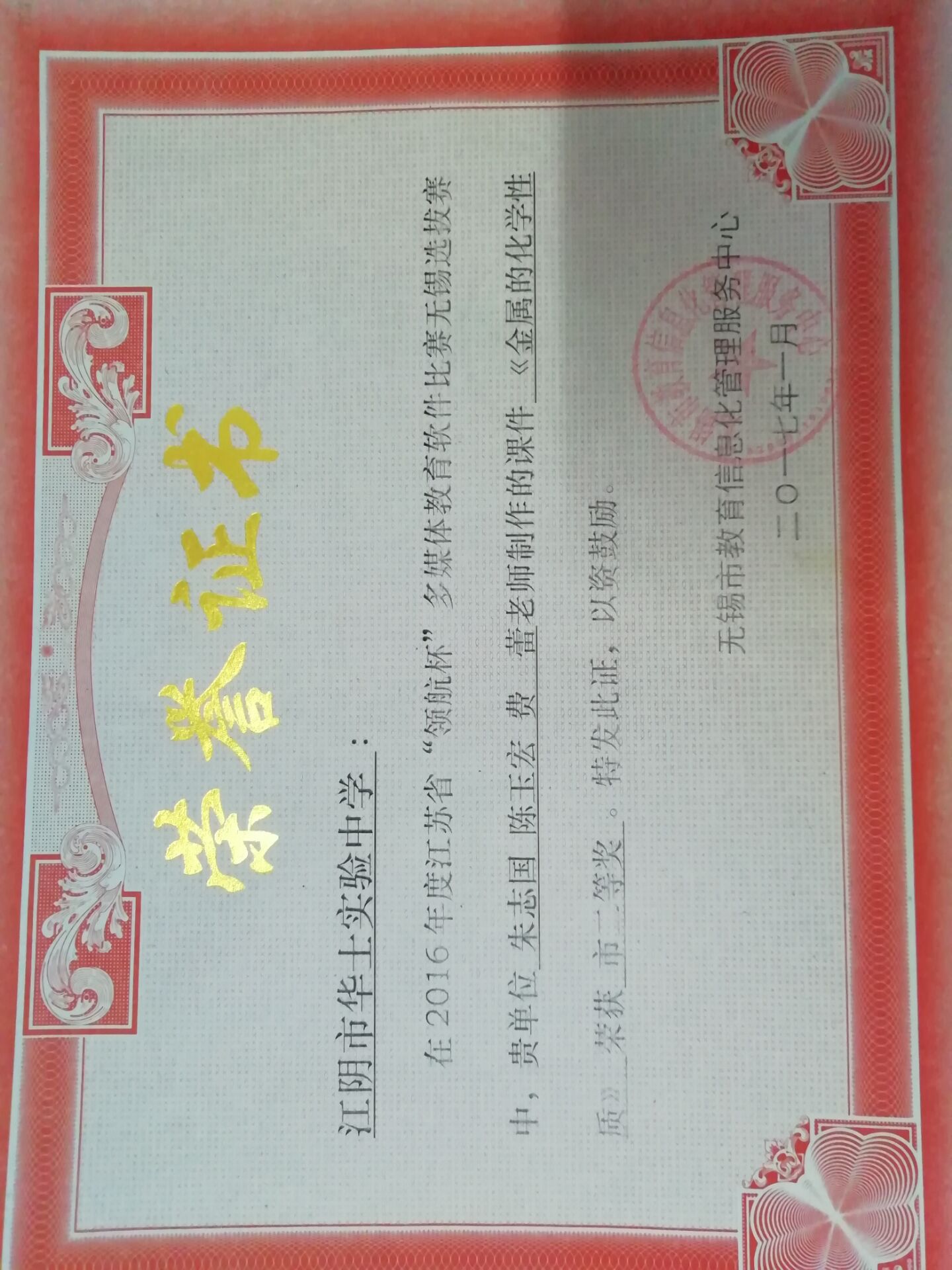 赵妍妍老师 获得无锡市高中语文学科优秀课评比 一等奖