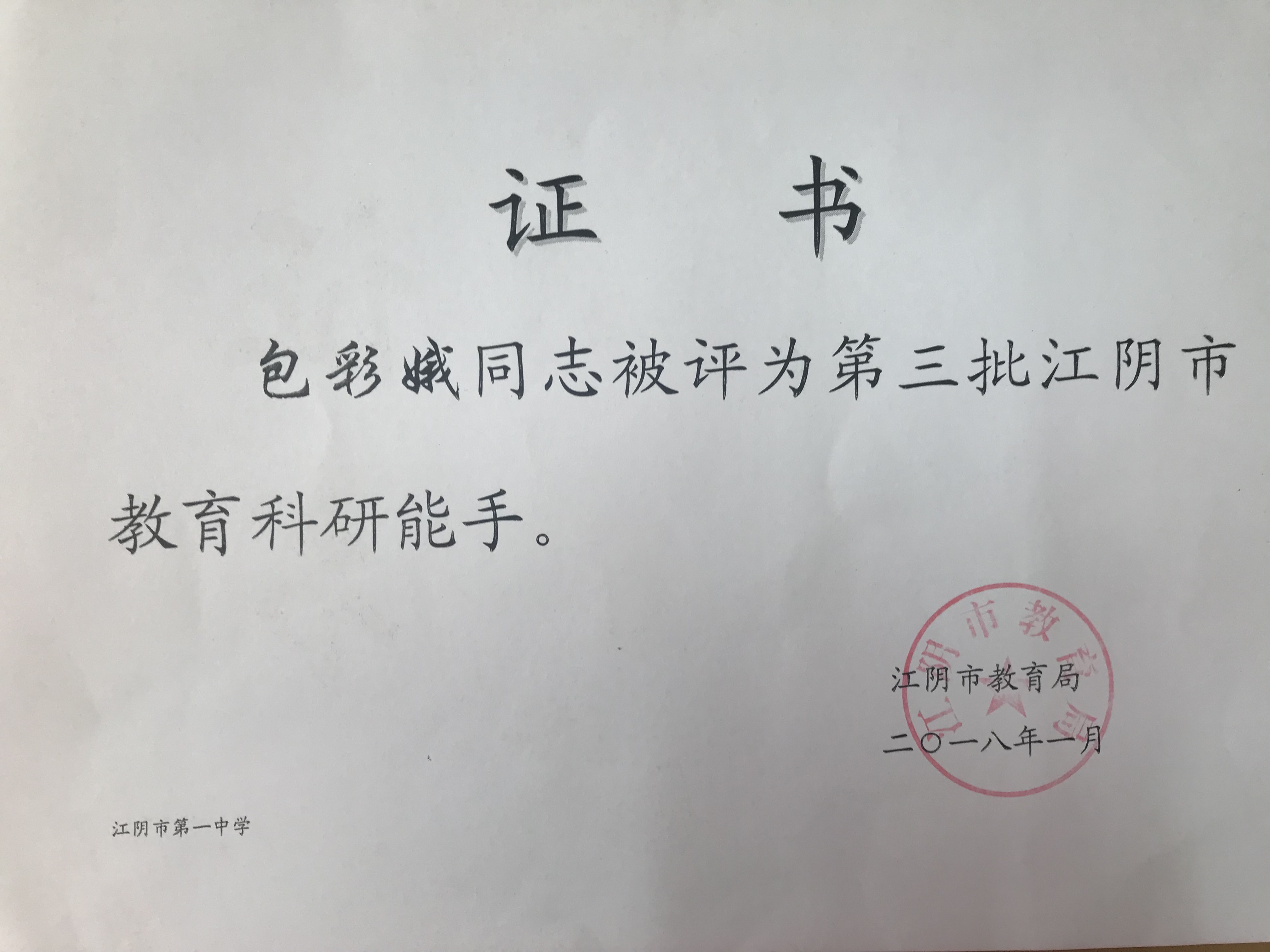 祝贺工作室包彩娥老师获评“江阴市教科研能手”
