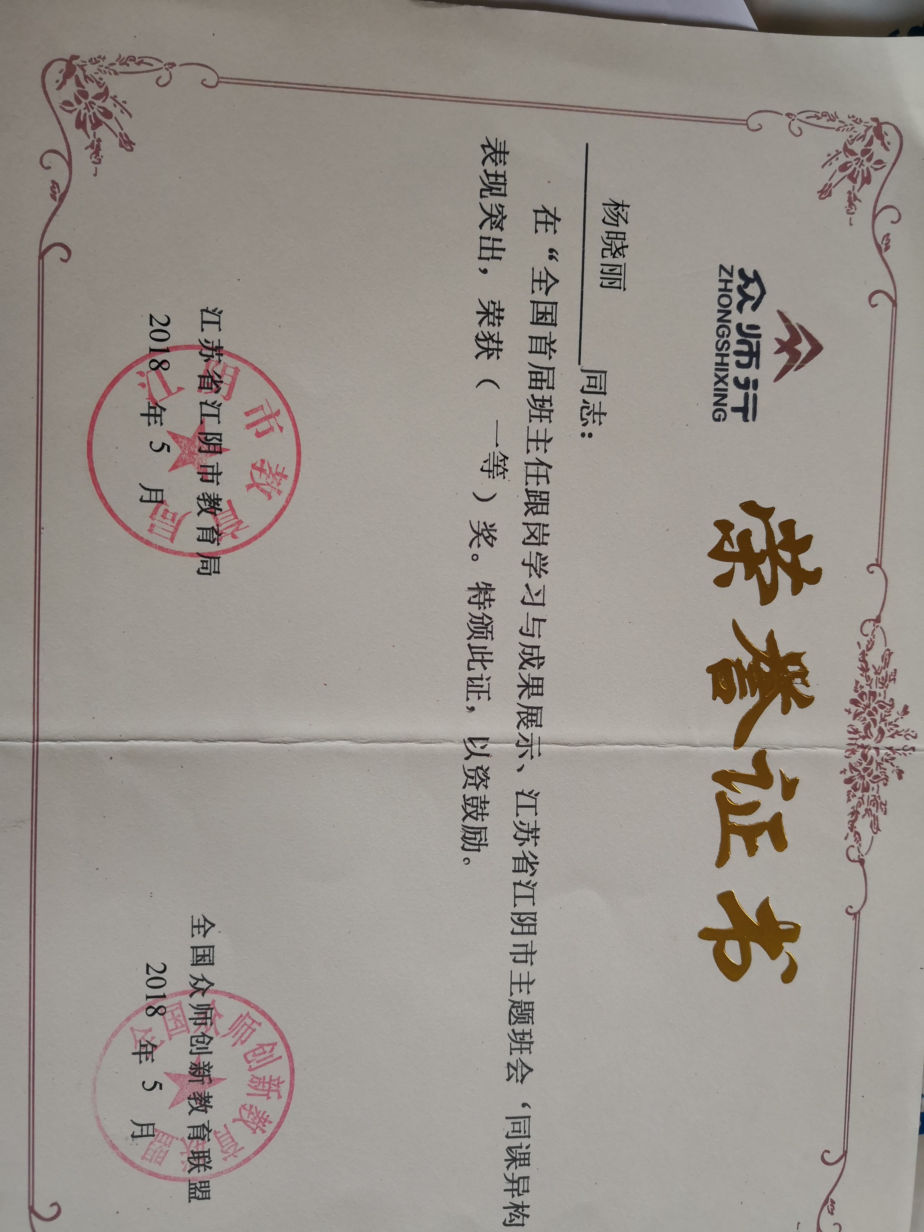 祝贺杨晓丽老师获得江阴市家庭教育课堂比赛一等奖