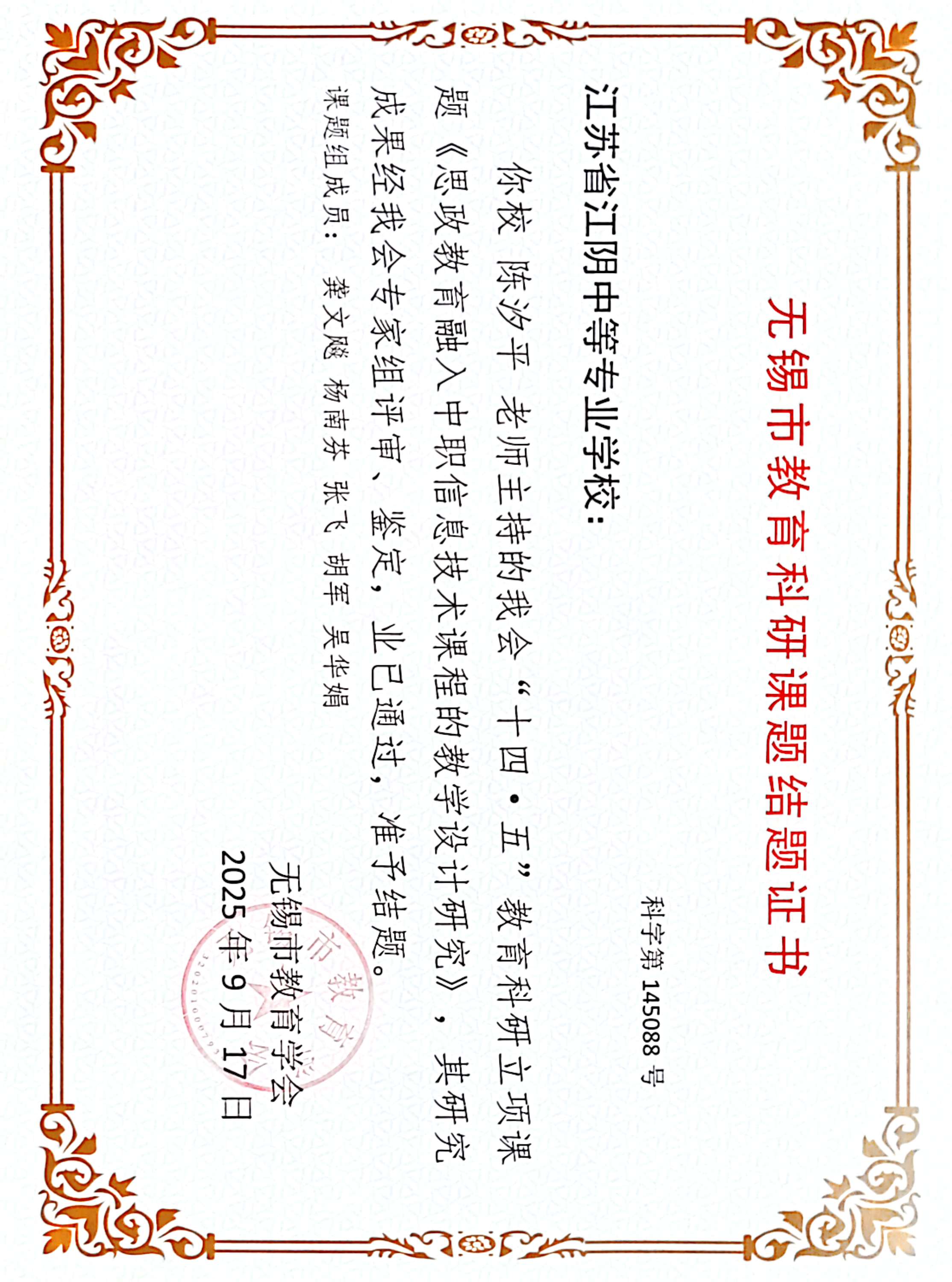 龚文飚老师参与研究的无锡市教育科研课题结题