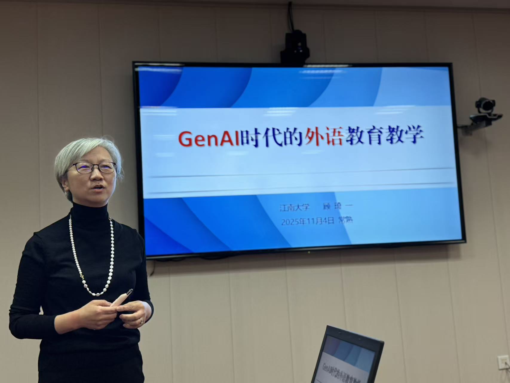 随后,江南大学外国语学院副院长顾琦一教授作了《Gen AI 时代的外语教学新格局》的讲座,顾教授首先分析了当前的趋势与变革,指出人工智能技术正深刻重塑外语教学格局,推动 "人工智能 +" 与教育深度融合。分析了教师使用AI辅助教学的现状,揭示了语言学习的本质属性并提出了明确的改革路径,强调未来改革要以教师为核心,构建清晰的外语教师能力框架与评价机制;以教材为突破,借助情感、行为、认知与伦理框架,推动AI赋能语言学习素养真正落地,最终实现人机协同、跨界融合的英语教学新样态。两位专家的报告高屋建瓴、内容翔实,现场反响热烈,掌声频频。