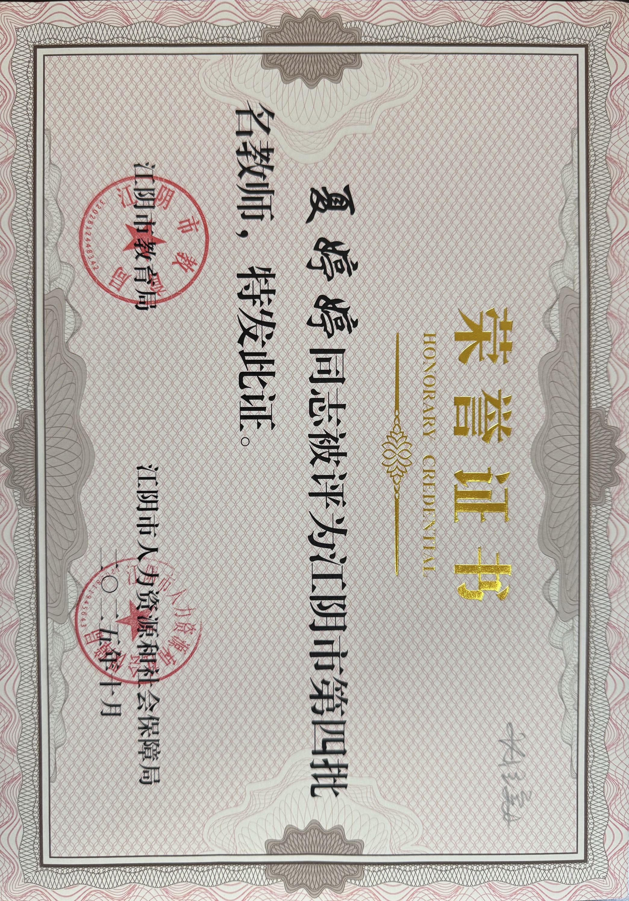 行政表彰22:沈晔名师工作室夏婷婷同志被评为江阴市第四批名教师