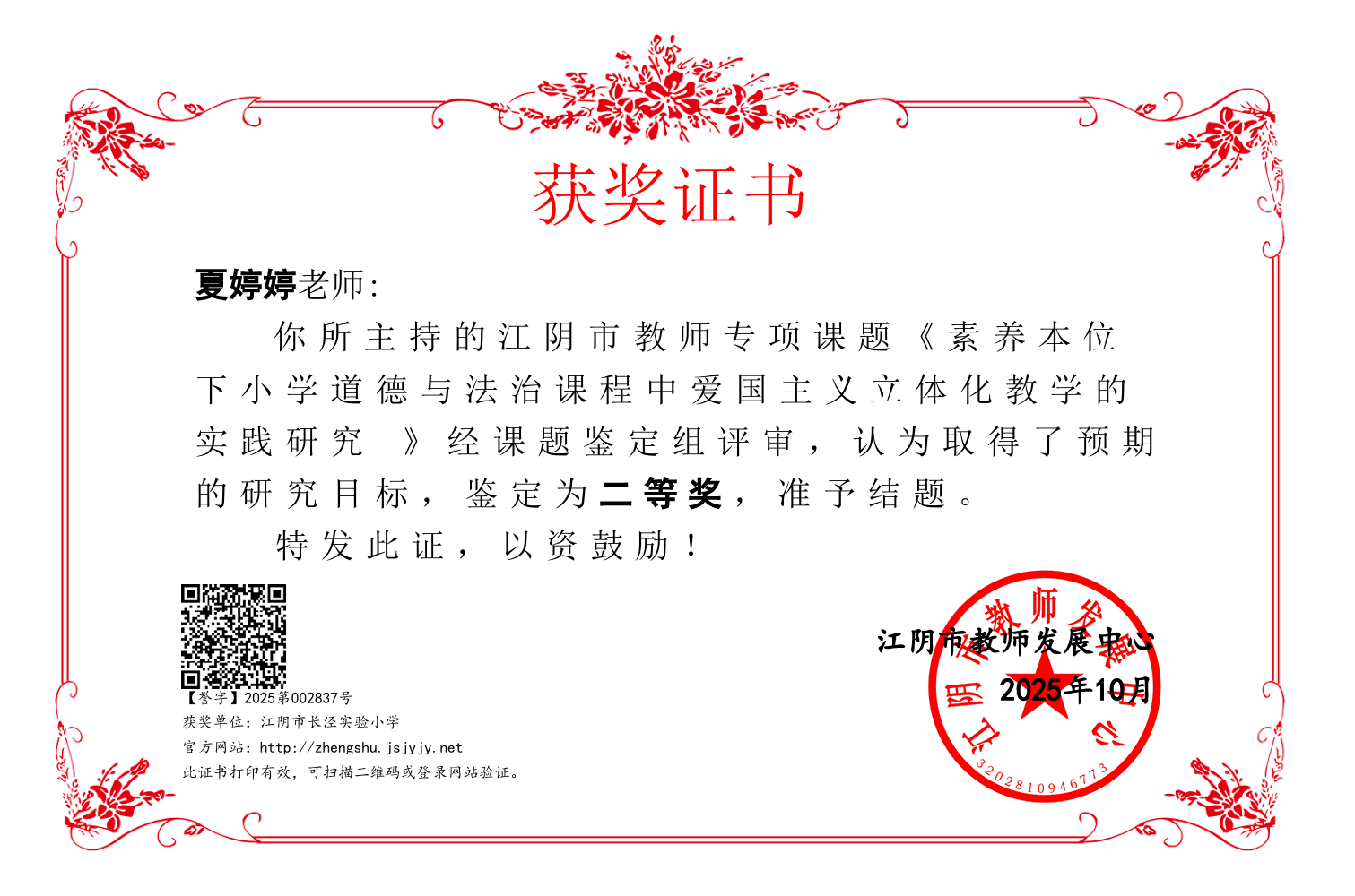 沈晔名师工作室夏婷婷江阴市教师专项课题获二等奖