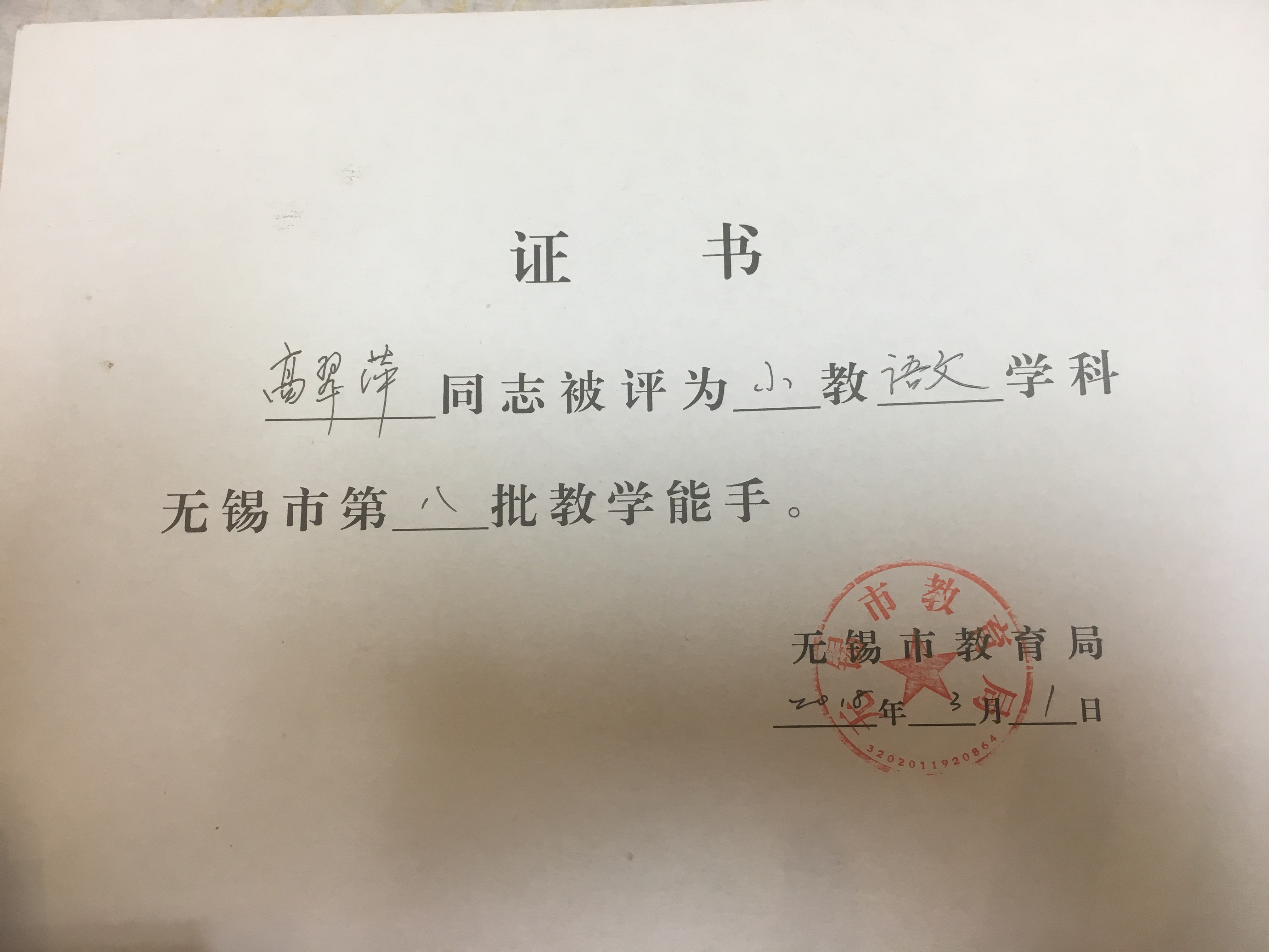 高翠萍同志被评为小教语文无锡市第八批教学能手