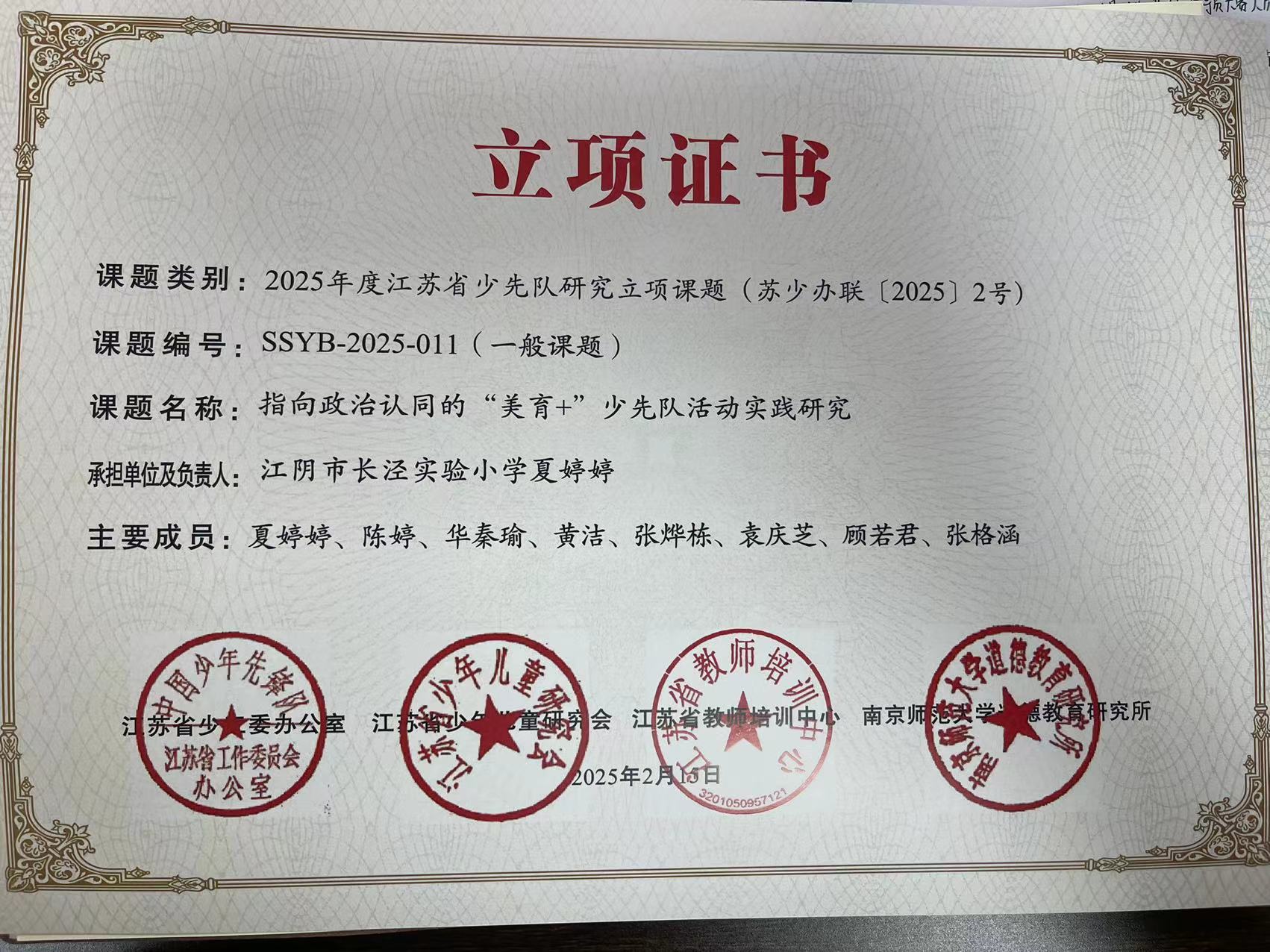 沈晔名师工作室夏婷婷江苏省少先队研究课题立项