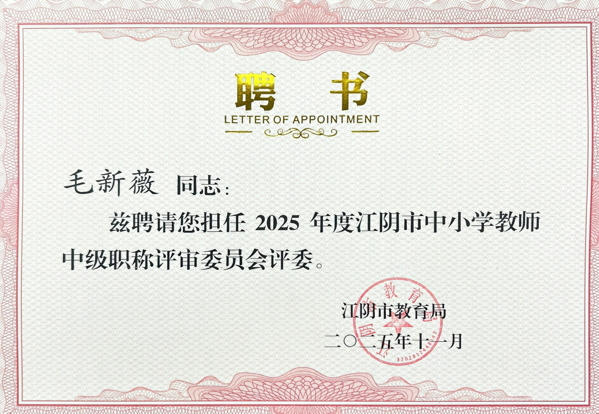 毛新薇担任2025年江阴市中小学教师中级职称评审委员会评委