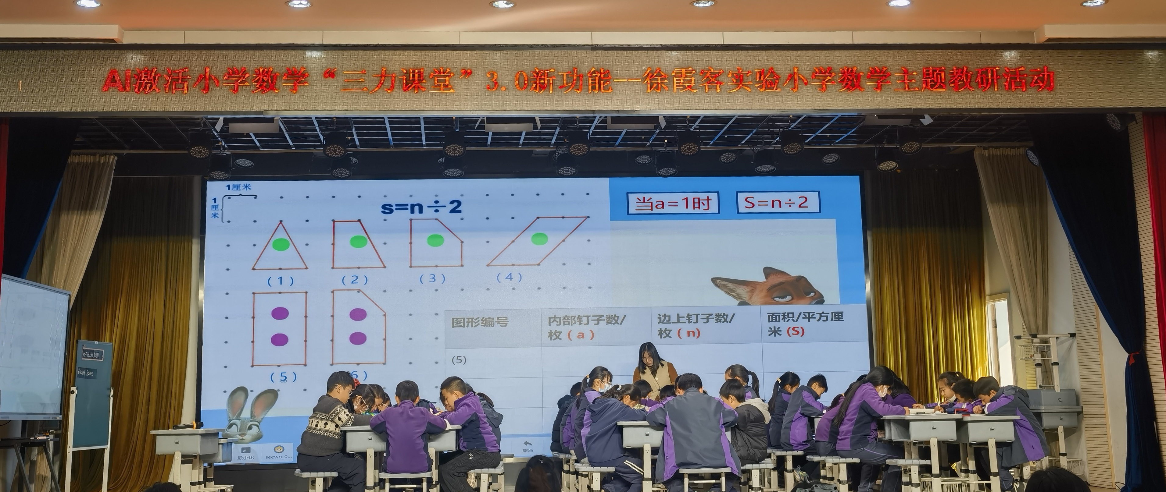 青阳实验小学的王韵雯老师执教了五年级《钉子板上的多边形》一课,AI工具全程辅助探究:学生通过平板操作“虚拟钉子板”绘制多边形,AI系统实时统计钉子数、计算面积并生成对比表格;当学生提出猜想时,AI软件直接动态演示,直观呈现“多边形面积与钉子数的关联规律”——彻底解决传统教学中“手动统计繁琐、规律感知模糊”的问题,让抽象数学关系 “看得见、摸得着”。