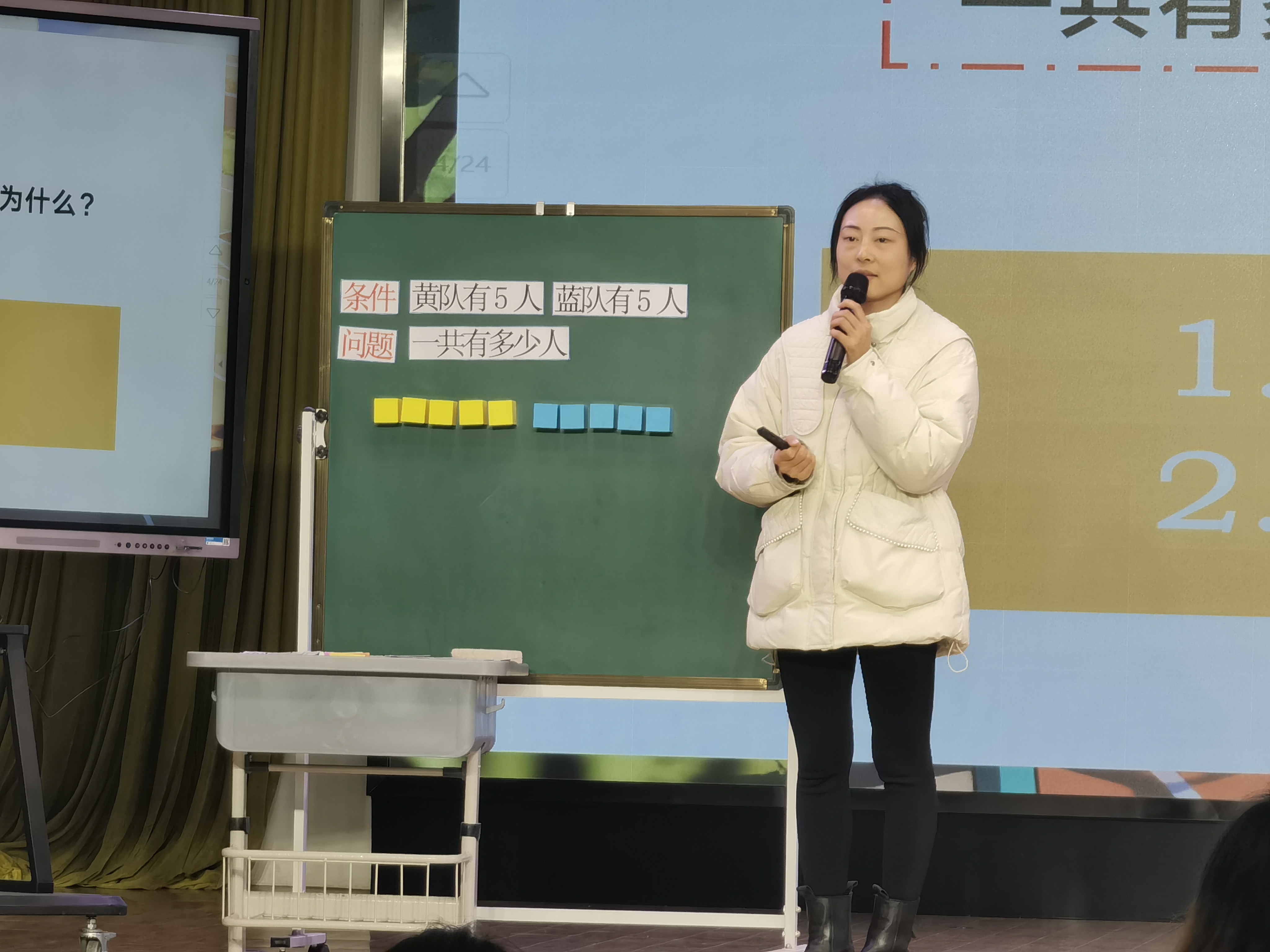 峭岐实验小学李甜老师《简单的加减法实际问题》:本节课以情境导入,先明确题目条件与问题;通过摆一摆、画一画的操作,帮助学生理解“5+5=10”的运算意义,明确“求总数用加法”的解题逻辑。接着拓展逆向题型,借助图示让学生理解“10-5=5”的推导过程,厘清“求部分用减法”的思路。最后通过 AI智慧盲盒游戏开展趣味巩固练习,整体以直观演示结合逻辑分析的方式,扎实梳理了加减法实际问题的解题思路。