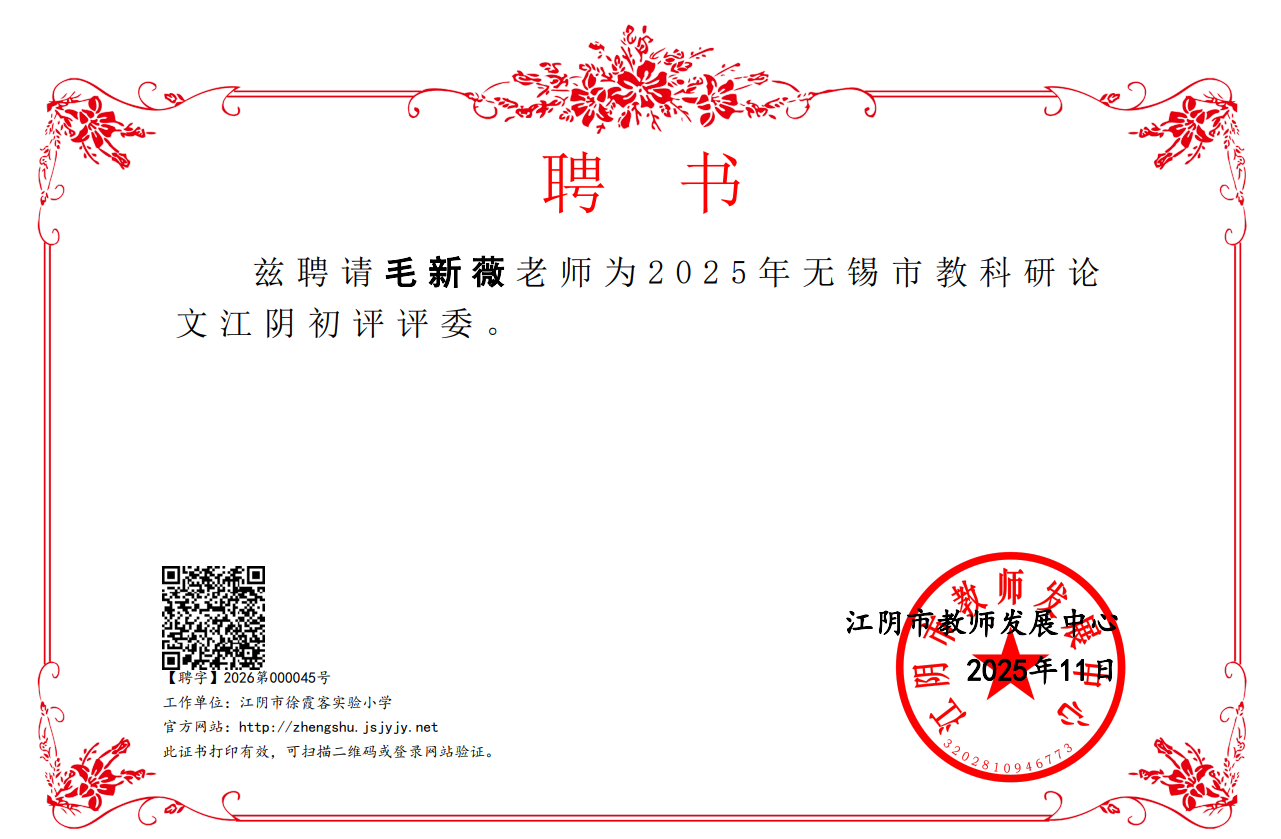 毛新薇担任2025年江阴市中小学教师中级职称评审委员会评委
