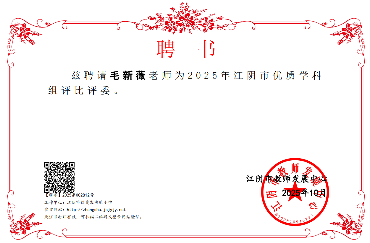 毛新薇担任2025年无锡市教科研论文江阴初评评委