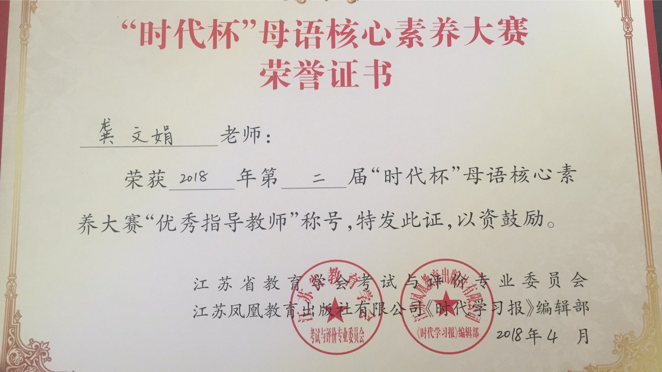 荣获2018年第二届“时代杯”母语核心素养大赛“优秀指导教师”称号