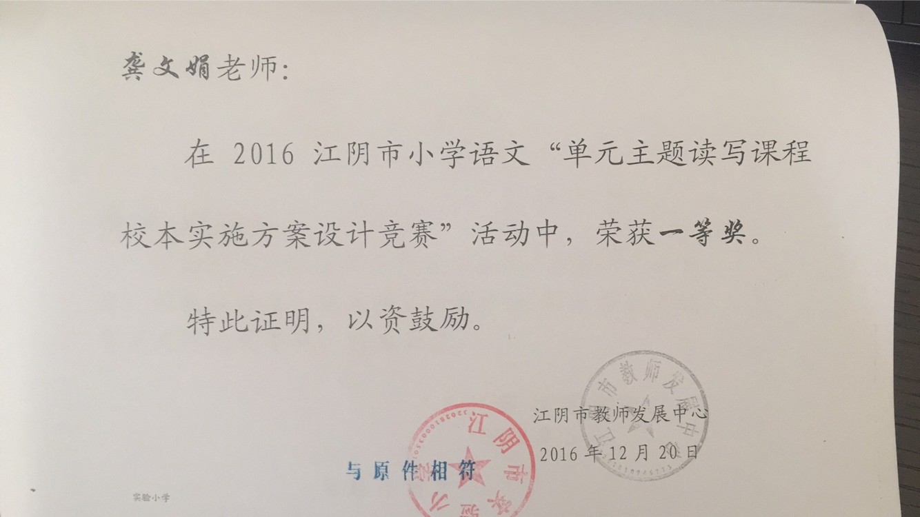 “单元主题读写课程小本实施方案设计竞赛”活动中荣获一等奖