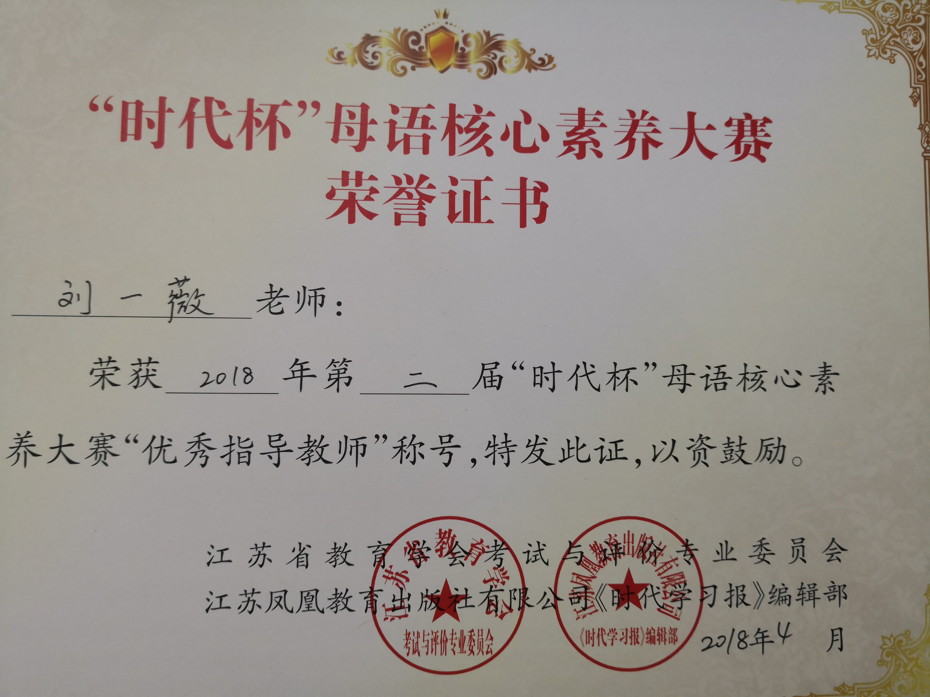 荣获2018年第二届“时代杯”母语核心素养大赛“优秀指导教师”称号