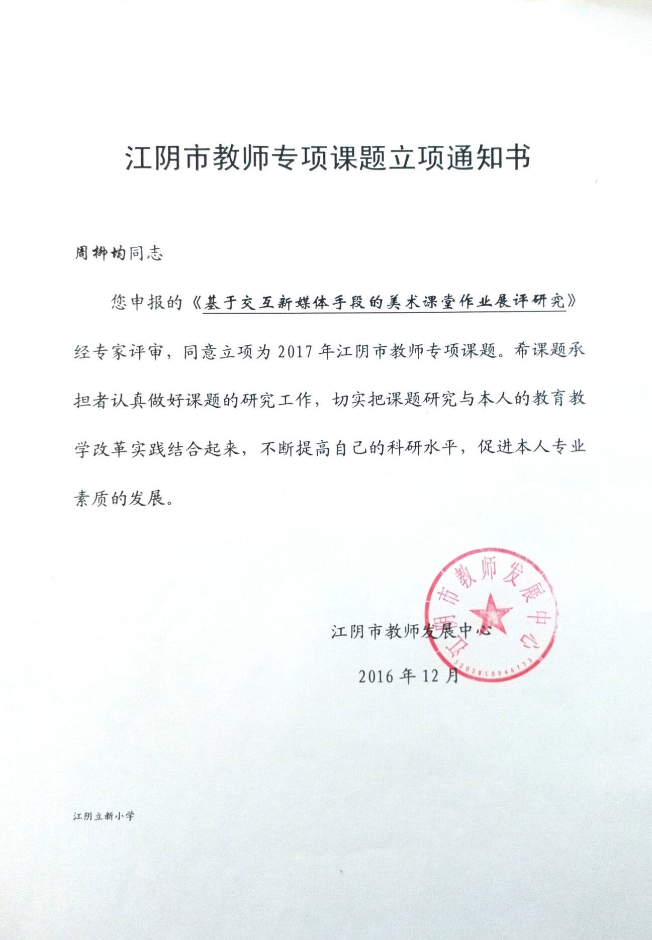 周柳均老师江阴市《基于交互手段的美术课堂作业展评研究》立项课题