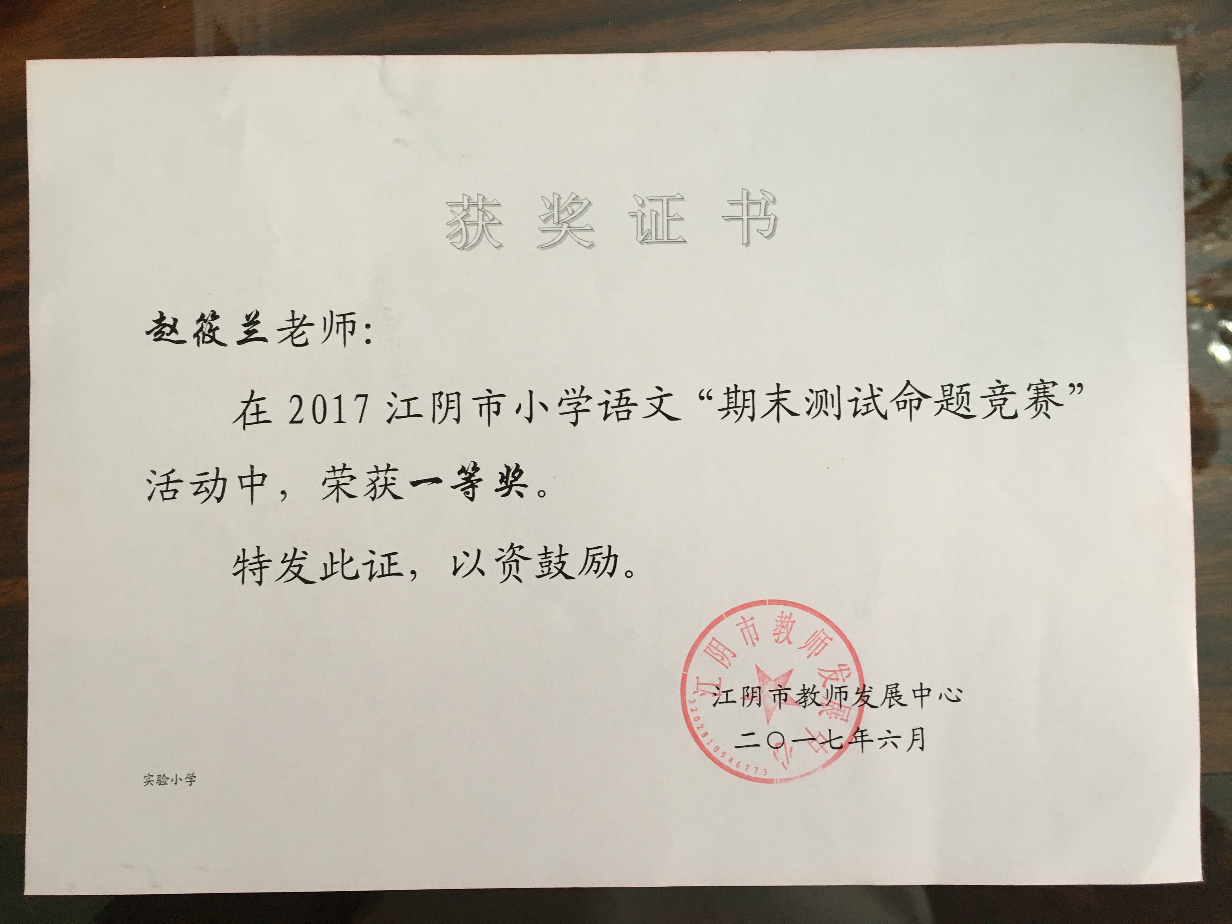 赵筱兰老师在“期末测试命题竞赛”活动中获一等奖