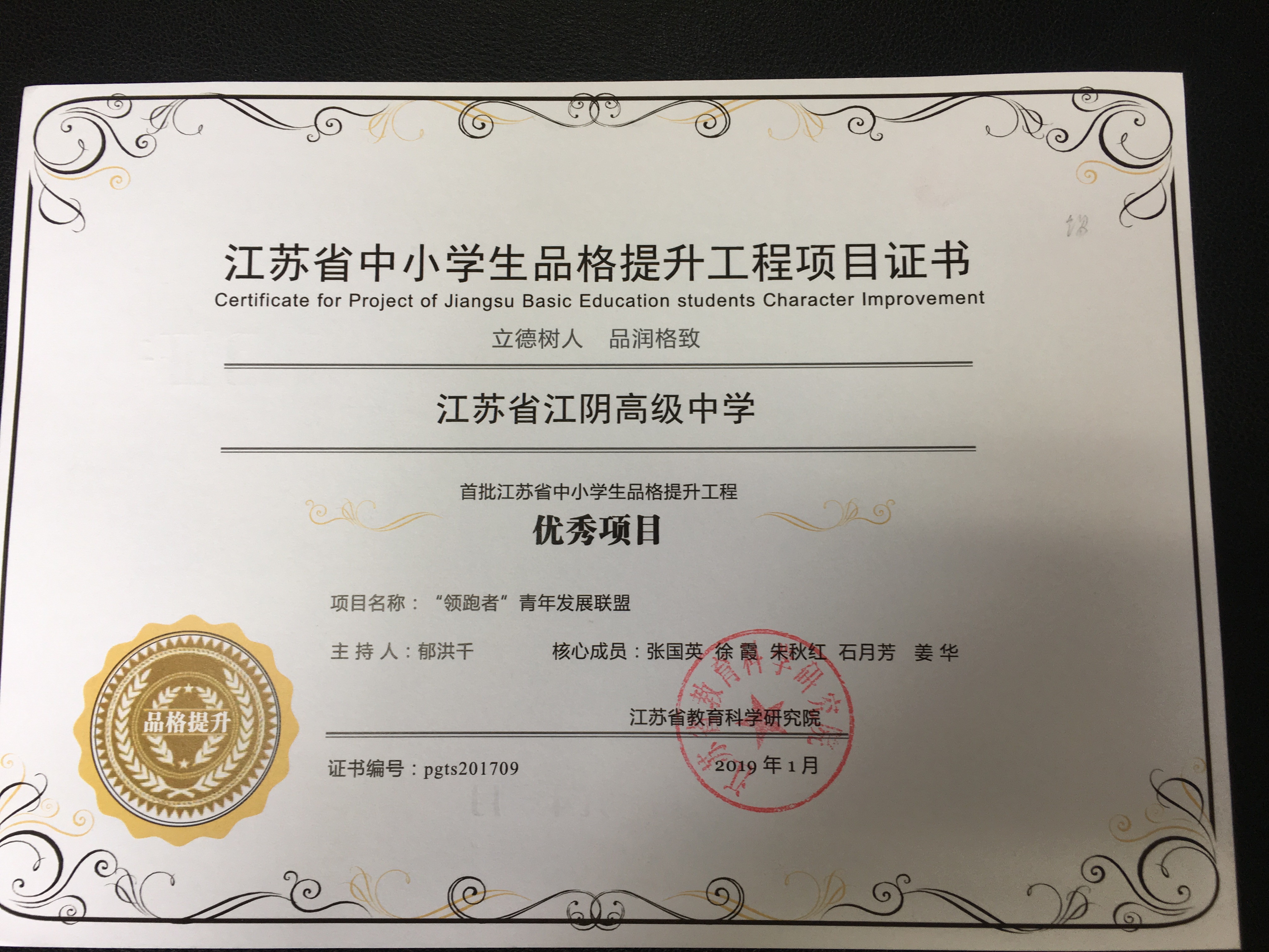 江阴高中“领跑者“青年发展联盟江苏省品格提升工程顺利结项
