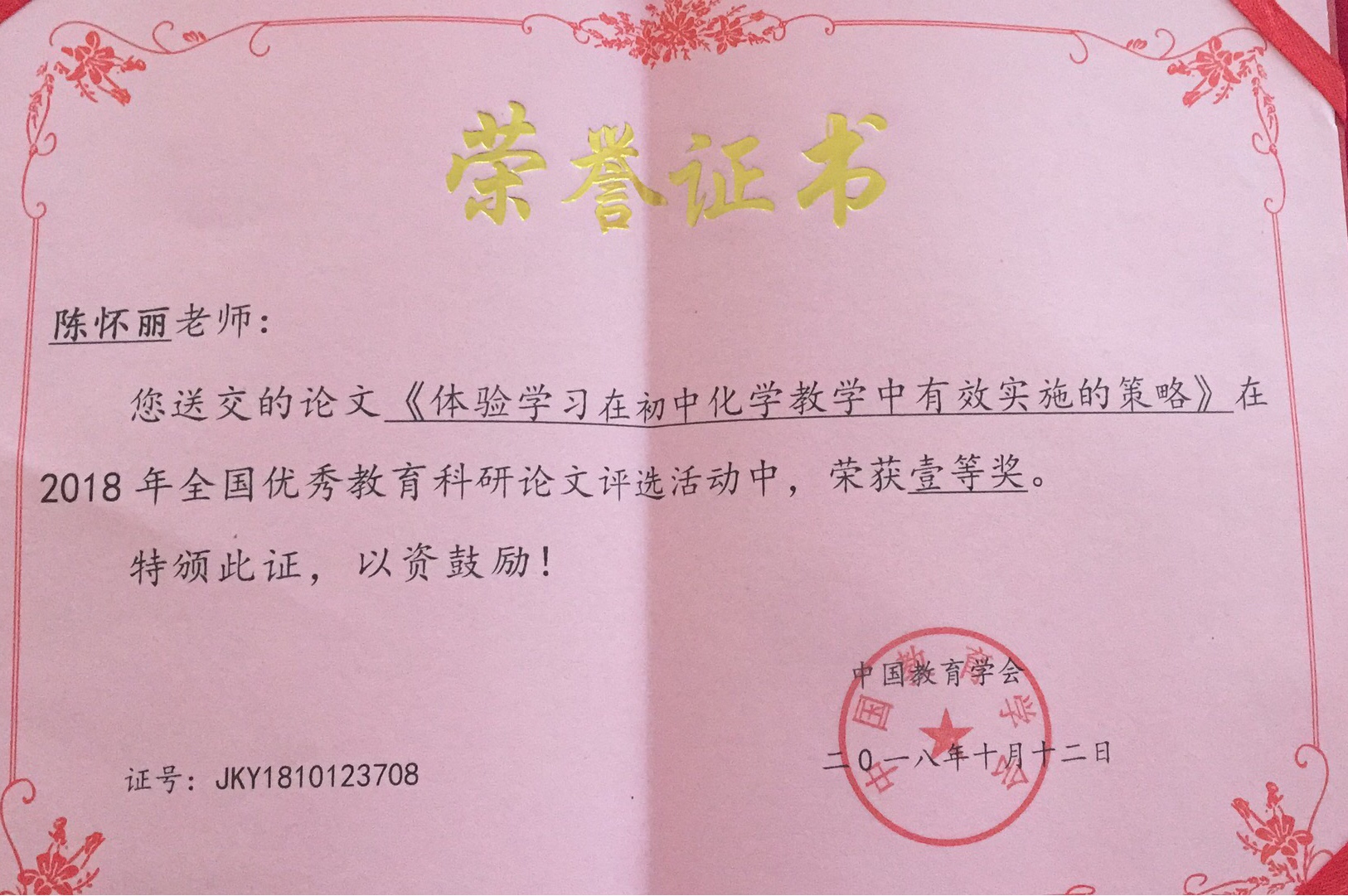 陈怀丽老师论文获奖