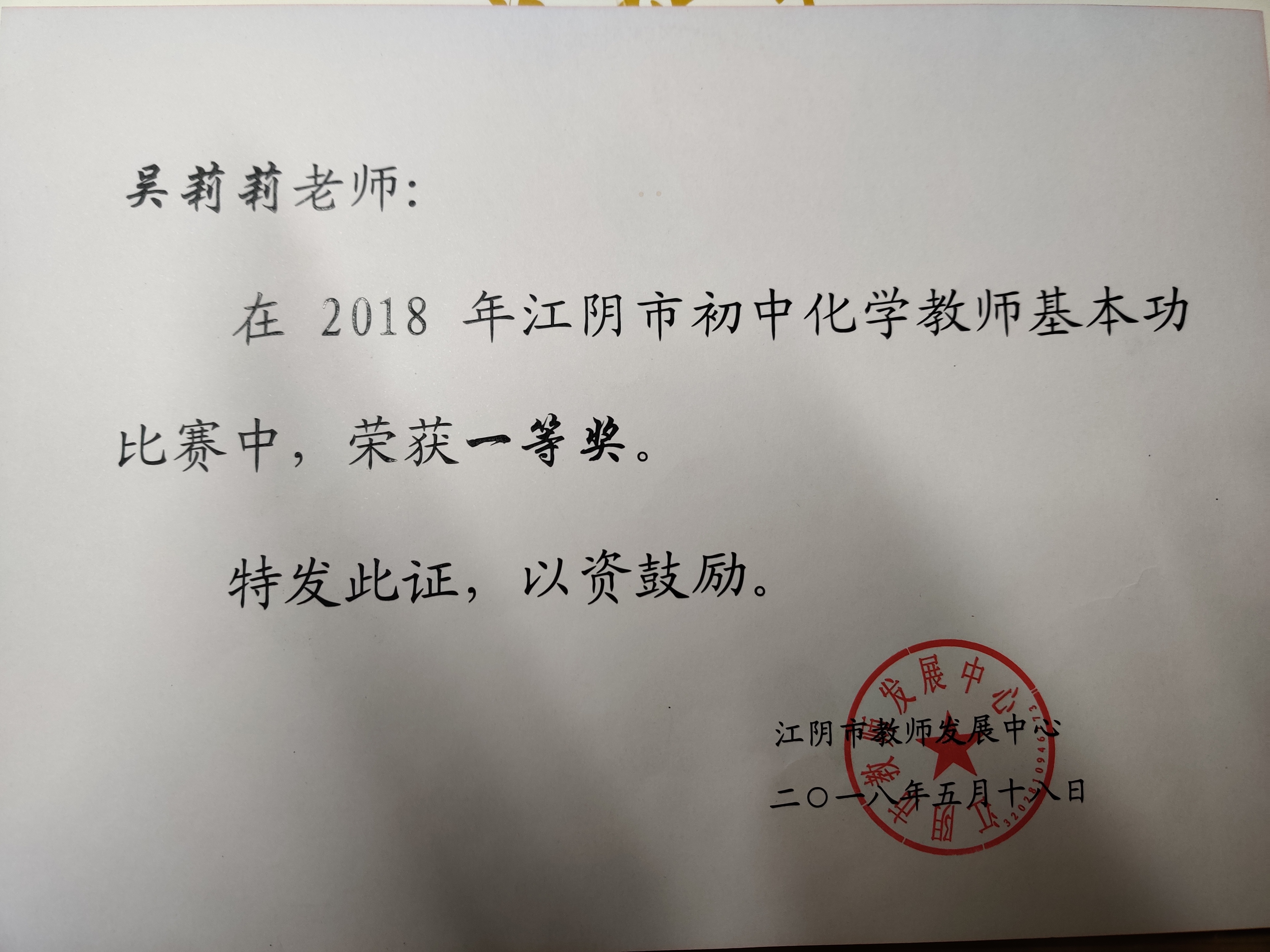 吴莉莉老师获江阴市教学基本功大赛一等奖