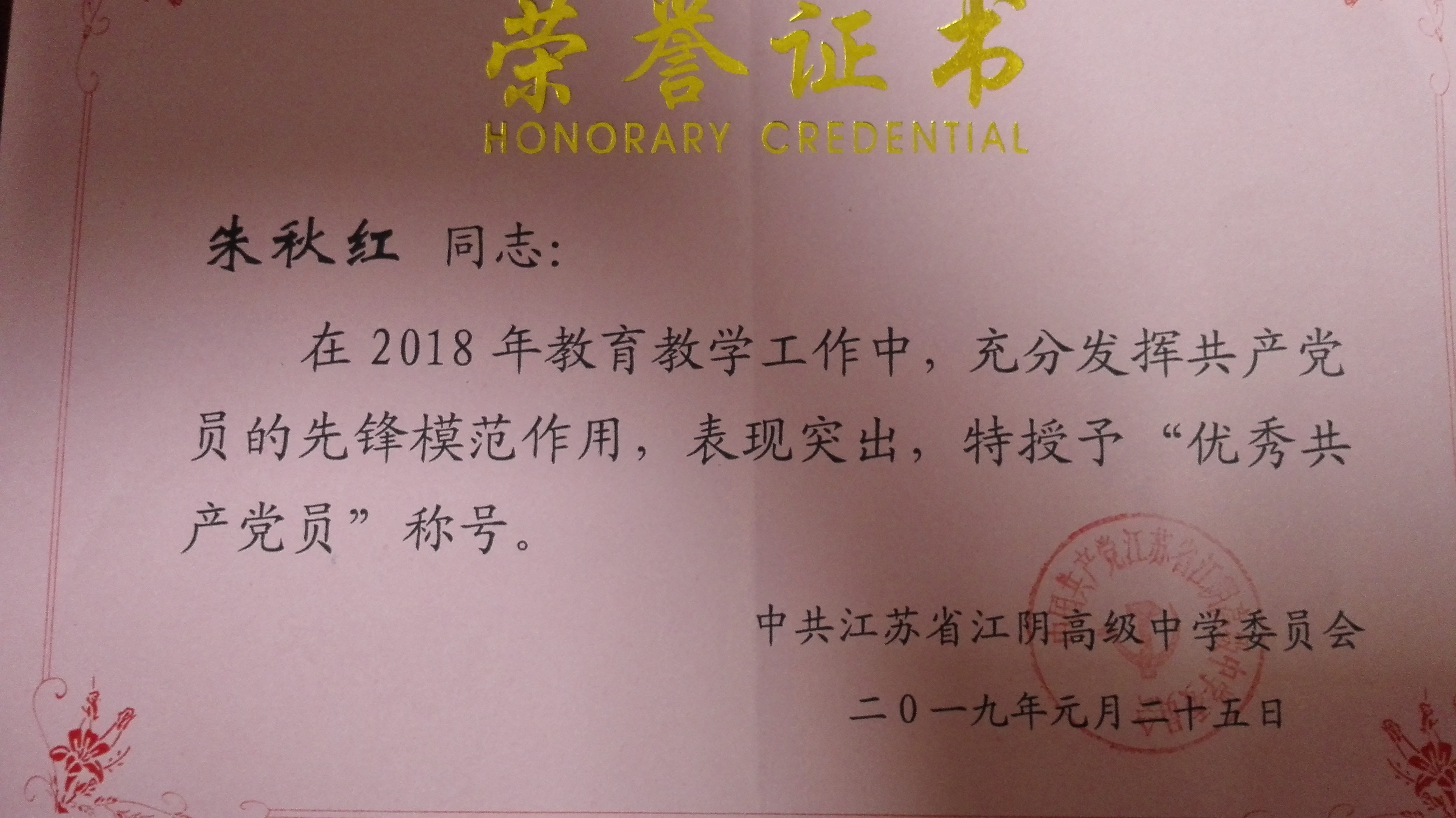 朱秋红同志获得优秀共产党员