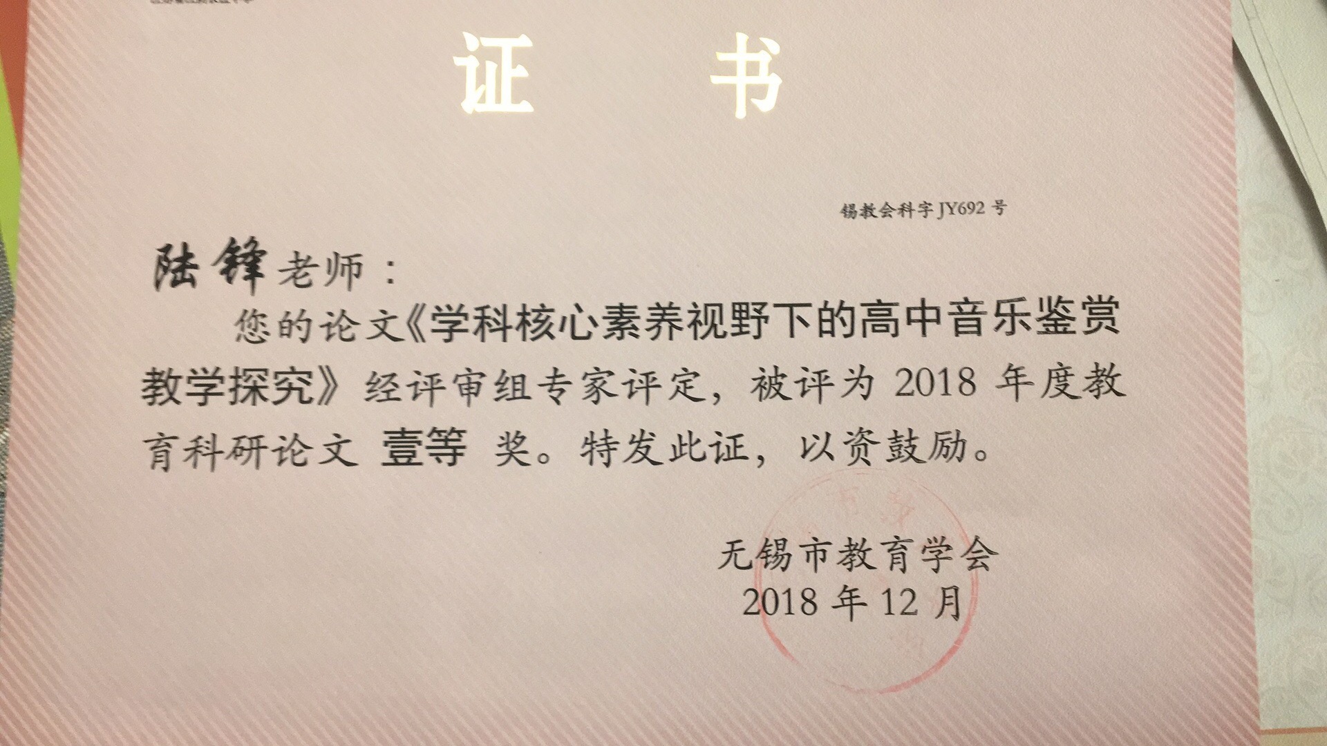 陆峰老师荣获论文评比一等奖